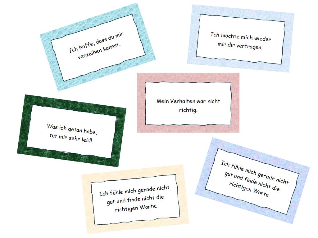 Um Konflikte erfolgreich und zügig zu lösen, gibt es die Möglichkeit, vorformulierte Entschuldigungsbriefe im Klassenzimmer bereit zu stellen. Mit deren Hilfe können die Schülerinnen und Schüler eigene Entschuldigungen mündlich als auch schriftlich aussprechen.