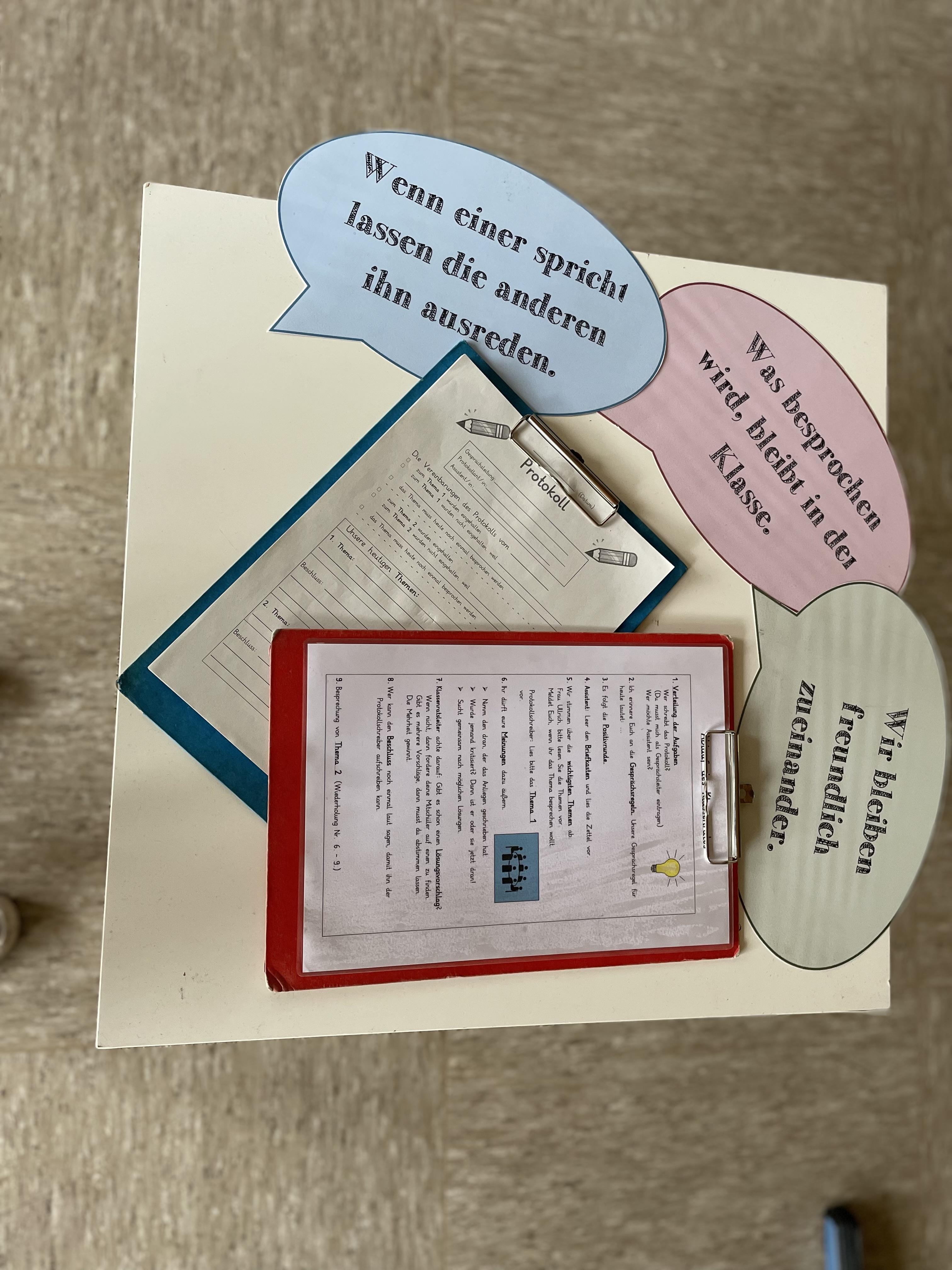 Auch das Einbringen und das Besprechen von Vorschlägen, Wünschen oder Beschwerden müssen zunächst durch die Lehrkraft demonstriert und präsentiert werden. Aufgrund dessen sollte die Lehrkraft zunächst den Klassenrat leiten, bis sie die Leitung ganz an die Schülerinnen und Schüler abgeben kann.