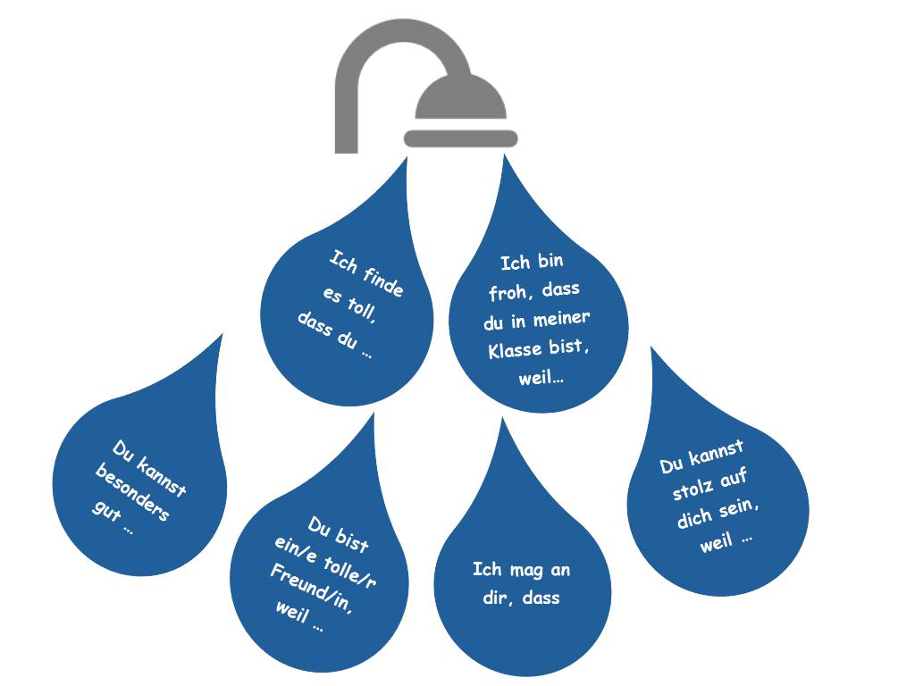 Bei der „warmen Dusche“ bekommt eine Schülerin oder ein Schüler von der gesamten Klassen Komplimente. Dies bietet sich z. B. als Geburtstagspost oder nach Bedarf an. Alle Lernenden überlegen für sich, welche Dinge er an einer Person der Klasse gut findet und mag. Dies wird aufgeschrieben und feierlich an die betroffene Person übergeben.