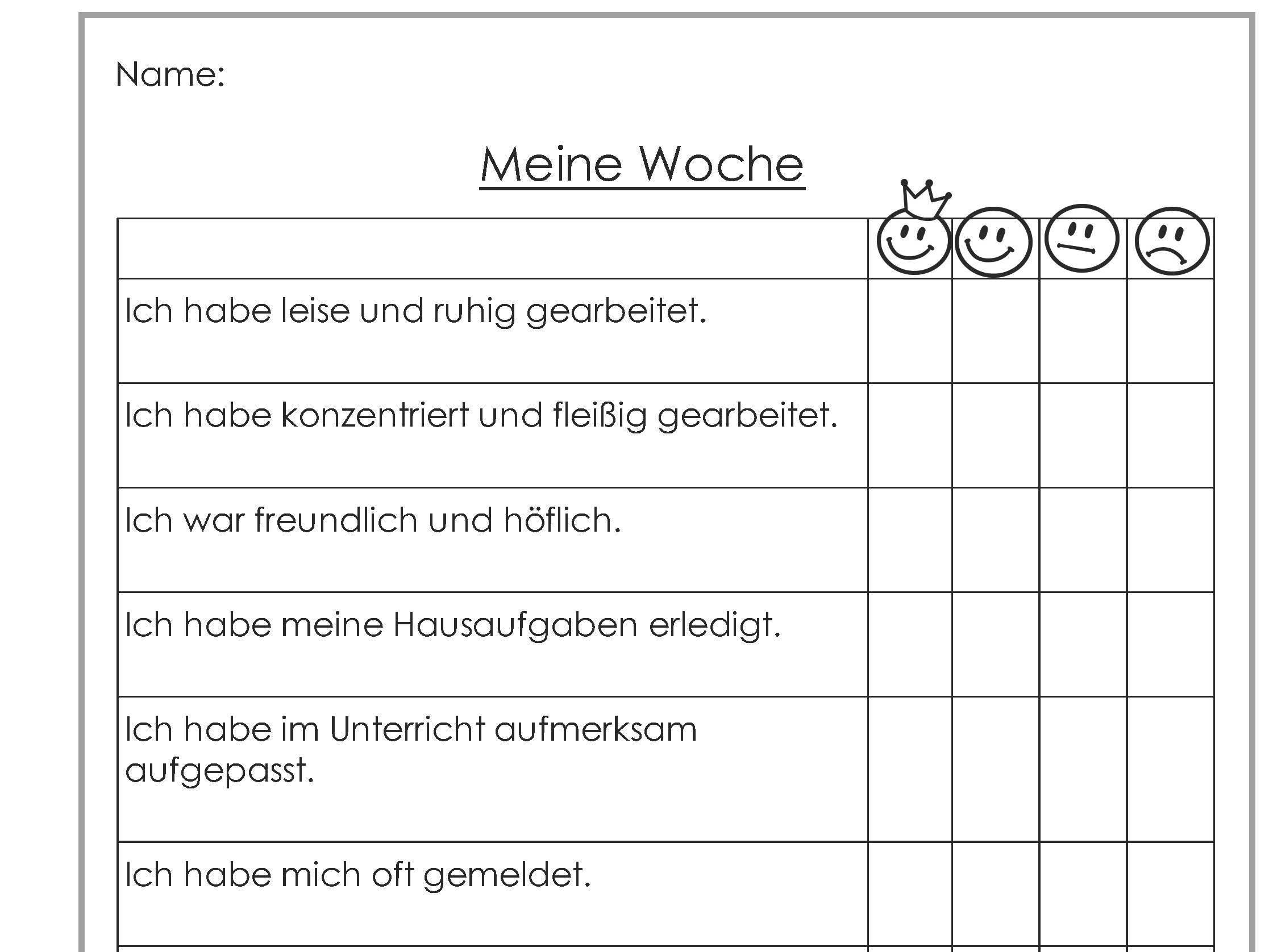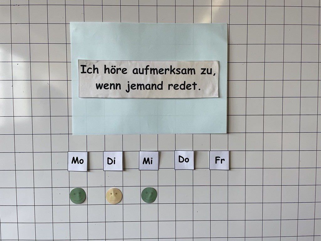 Mithilfe eines Reflexionsarbeitsblattes "Meine Woche" reflektieren die Schülerinnen und Schüler regelmäßig und konsequent ihr Verhalten innerhalb der vergangenen Woche. Dabei können unterschiedliche Aspekte beleuchtet werden. Eine Liste mehrerer positiver Verhaltensweisen wird hierbei aufgelistet und mithilfe von Smileys von den Schülerinnen und Schülern bewertet, z. B. "Ich war freundlich und höflich" oder "Ich habe Konflikte ruhig gelöst". Die Bewertung kann in unterschiedlichen Abstufungen erfolgen.