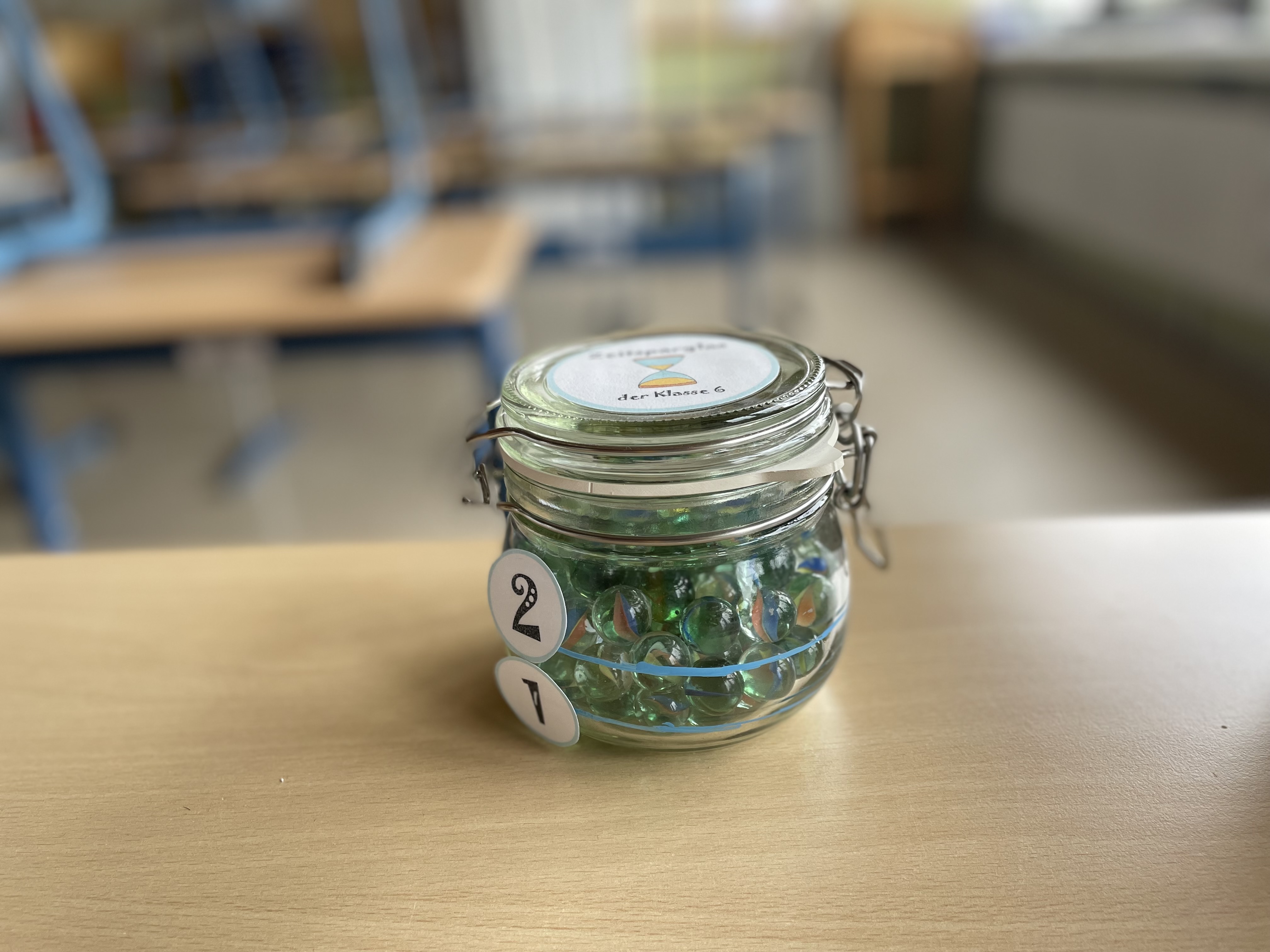 Das Zeitsparglas, als Verstärkersystem, kann ebenfalls als sozial–förderliches Ritual eingesetzt werden. Immer wenn die Klasse oder die Lehrkraft Zeit, z. B. durch „gutes Arbeiten“, „schnelles Arbeitsbereit-Sein“ oder „Nicht-Warten-Müssen“, eingespart hat, bekommt die Klasse eine Murmel (Token). Ist das Glas voll, wird die gewonnene Zeit „verschwendet“ und die Schülerinnen und Schüler dürfen sich etwas wünschen. Hier ist es wichtig, zu Beginn sehr häufig das Zeitsparglas einzusetzen, um die Klasse positiv verstärken zu können. Auch kann die ersparte Zeit durch mehrere Aktivitäten entnommen werden, welche unterschiedlich viel Zeit in Anspruch nehmen: z. B. halbes Glas 45 Minuten, ganzes Glas 90 Minuten.