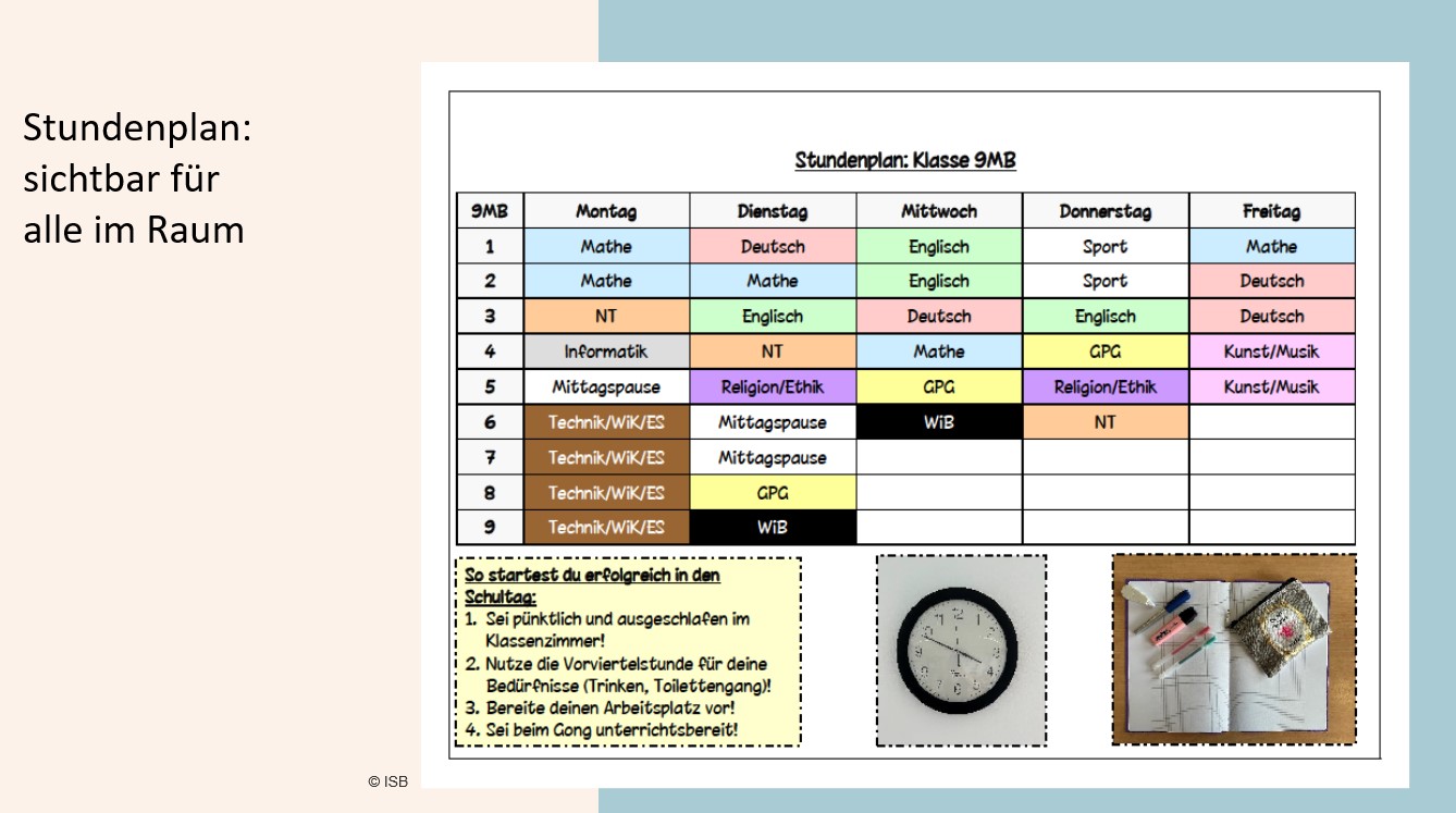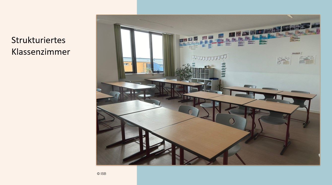 Klare Raumstrukturen geben Orientierung und vermitteln den Lernenden Sicherheit und eine gewisse Routine. Zu den Raumstrukturen gehört zum Beispiel ein fester Sitzplan, der klar die jeweiligen Sitznachbarinnen und -nachbarn anzeigt, darüber informiert, ob es bestimmte Bedürfnisse wie z. B. Sehhilfen zu berücksichtigen gilt oder aber auch die Strukturierung des Klassenzimmers selbst z. B. durch verschiedene Lern- und Arbeitsbereiche visualisiert.