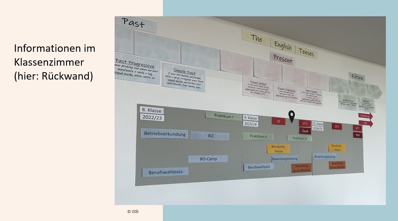 - thematische Aufteilung der Wände im Klassenzimmer (z. B. nach Fächern – „Deutsch-Wand“, „Mathe-Wand“…)