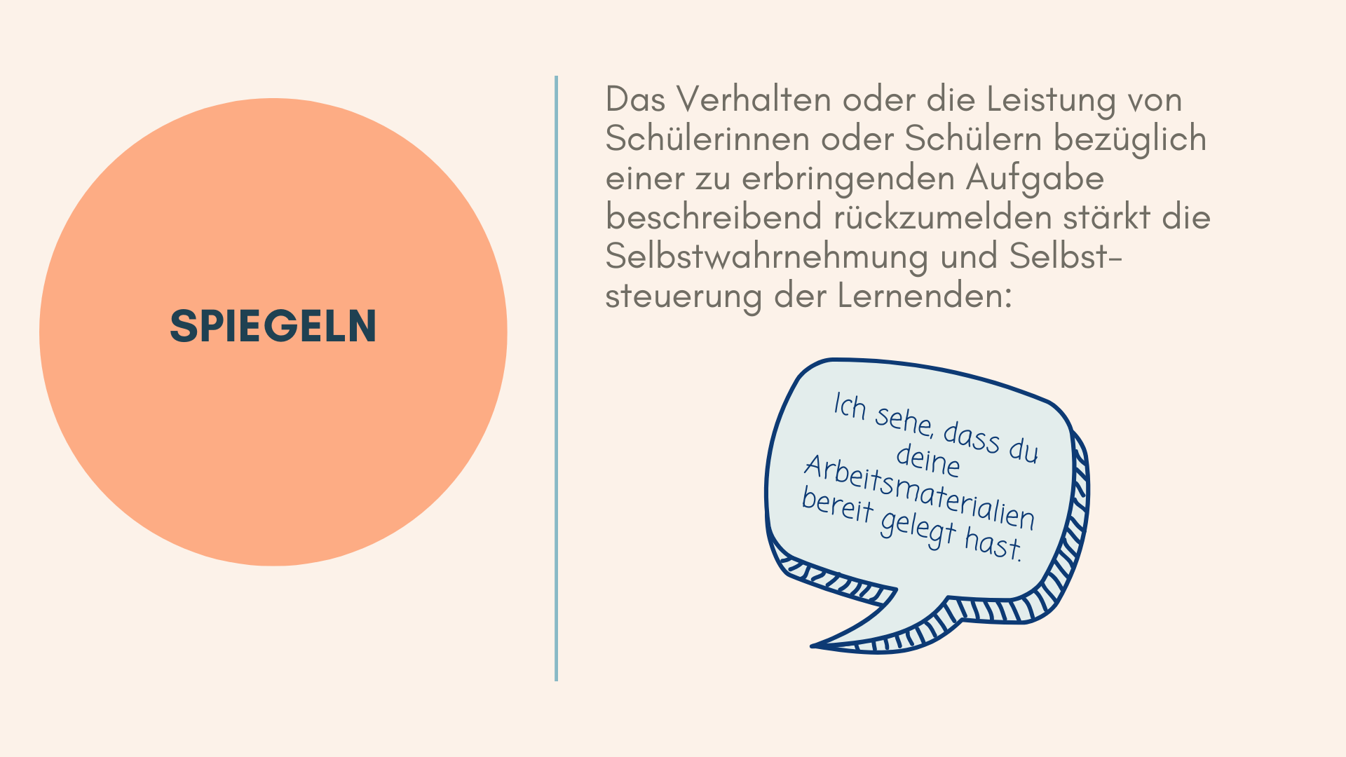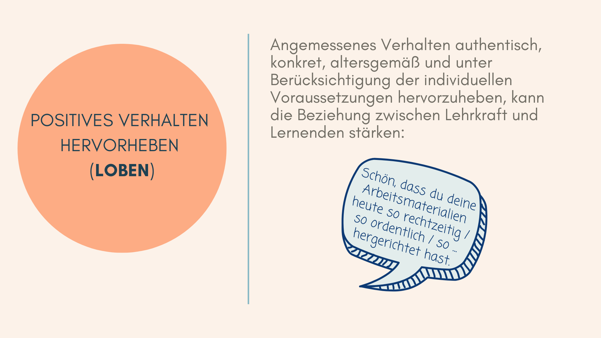 Schülerinnen und Schüler zu ermutigen und nicht zu ermahnen, Anerkennung und Wertschätzung auch bei Lernenden mit herausforderndem Verhalten zu zeigen, ist die Basis professionellen Handelns. Dies kann durch verschiedene Kleintechniken zur aktiven Intervention erreicht werden (wobei „aktive Intervention“ hier meint, dass eine gezielte Intervention aktiv eingesetzt wird, damit eine Schülerin/ein Schüler sich auf eine bestimmte Art und Weise verhält (Bergsson / Luckfiel 2021)):