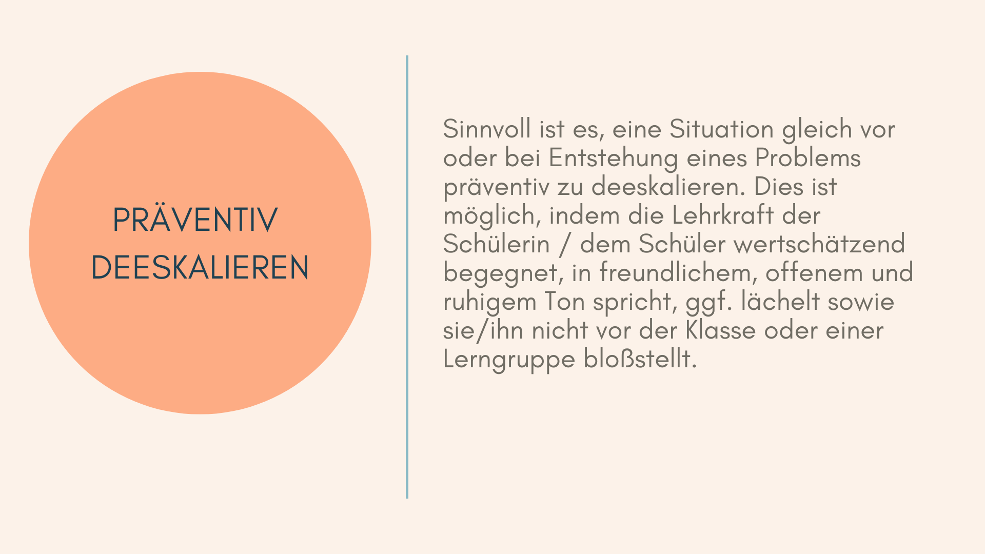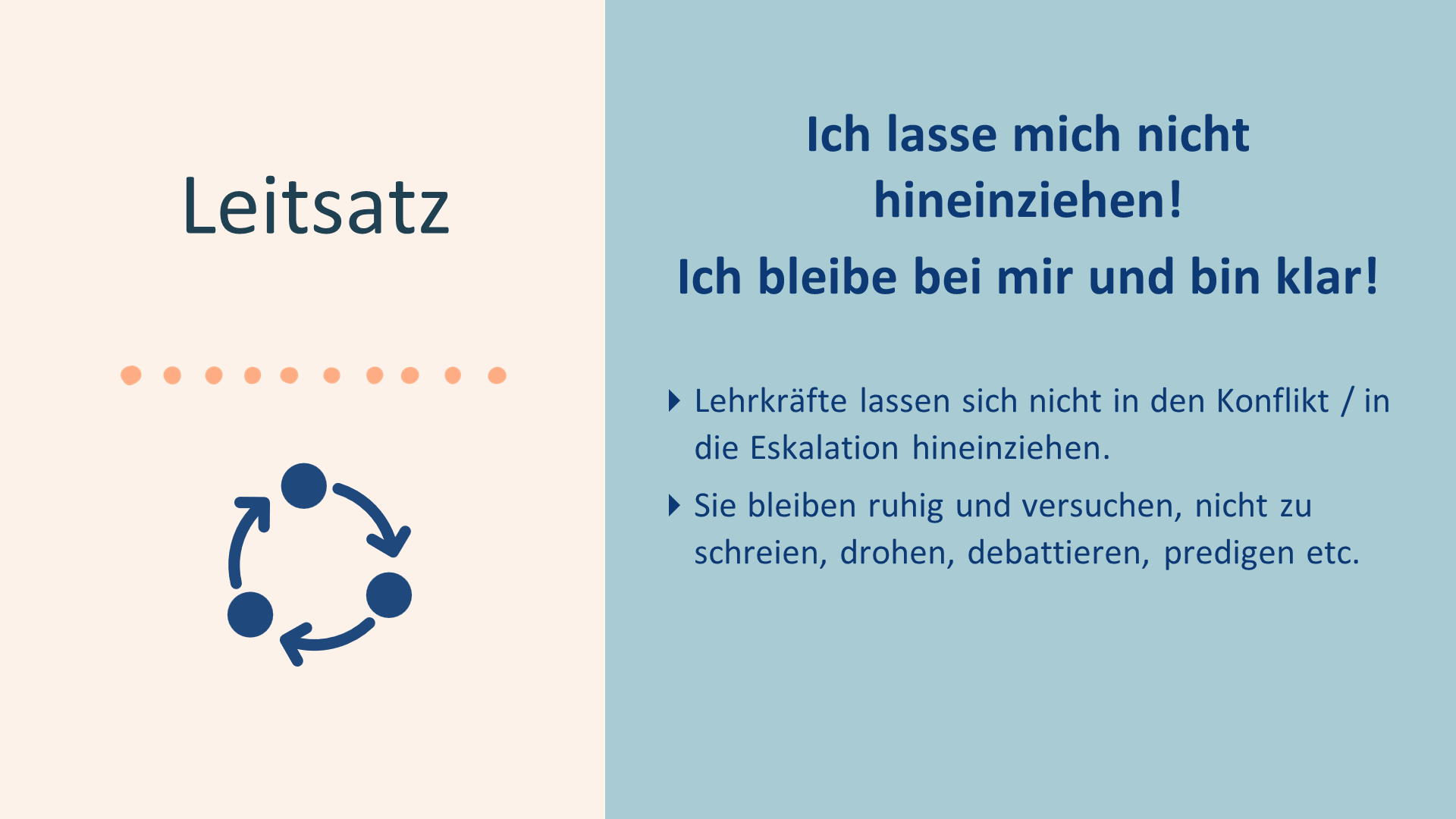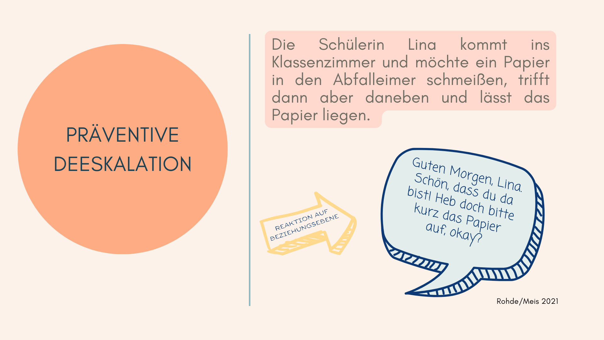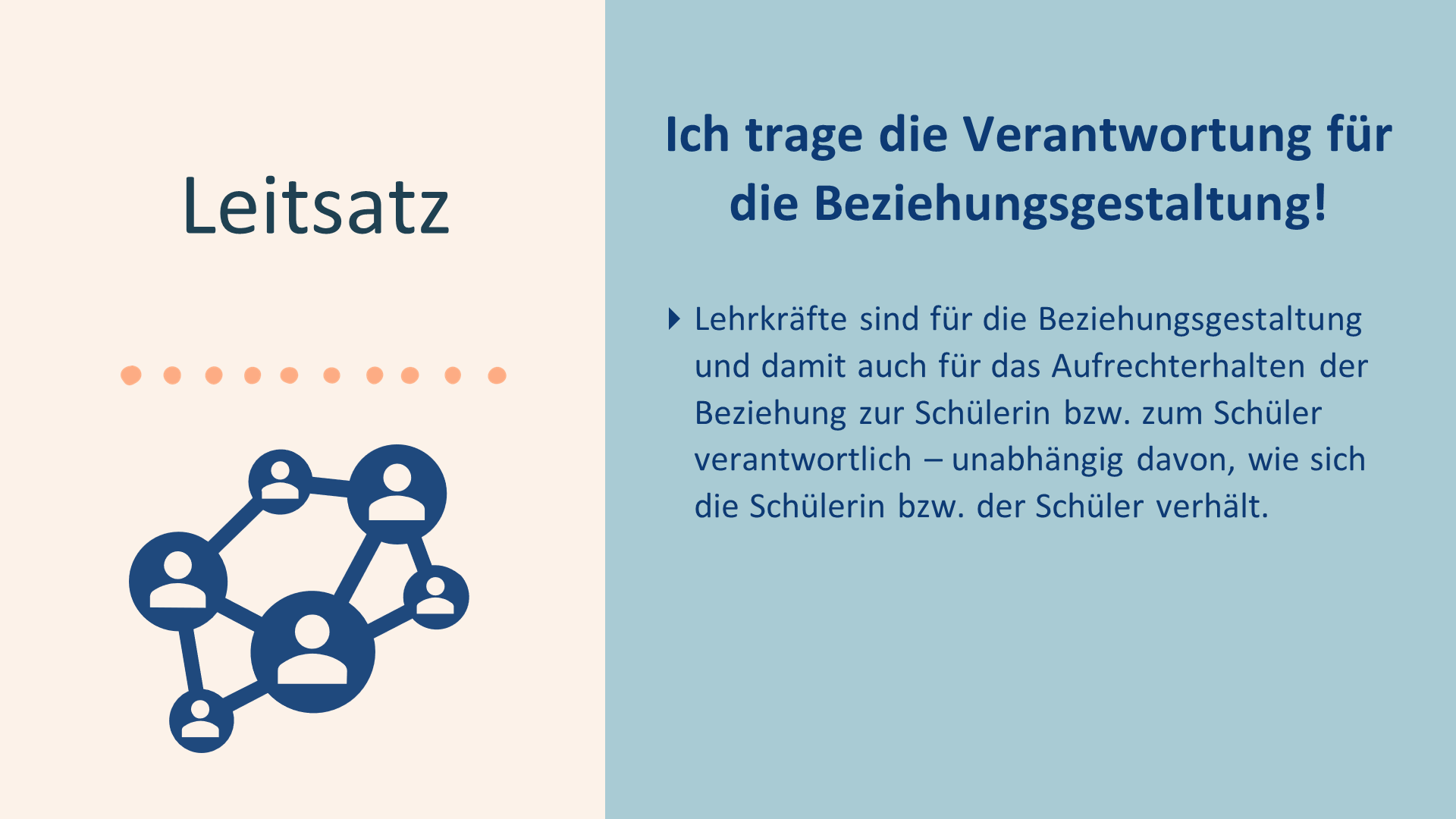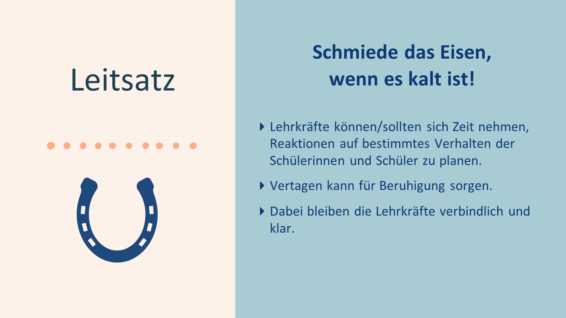 Die Antworten auf diese beiden Fragen ermöglichen es, die Schülerin/den Schüler zu verstehen und ein Beziehungsangebot zu machen anstatt mit Strafen oder sonstigen Konsequenzen zu drohen. Dieses pädagogische Handeln entspricht beispielsweise auch dem Grundsatz der Neuen Autorität (nach Haim Omer), das als Konzept im Kollegium etabliert werden kann: