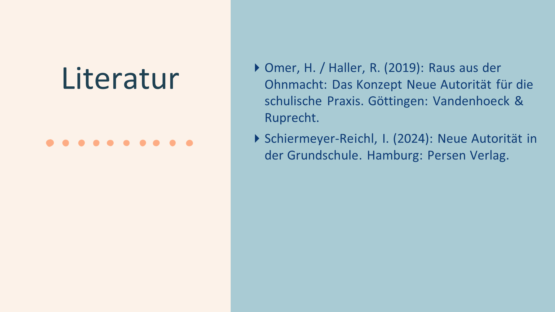 Omer, H. / Haller, R. (2019): Raus aus der Ohnmacht: Das Konzept Neue Autorität für die schulische Praxis. Göttingen: Vandenhoeck & Ruprecht.