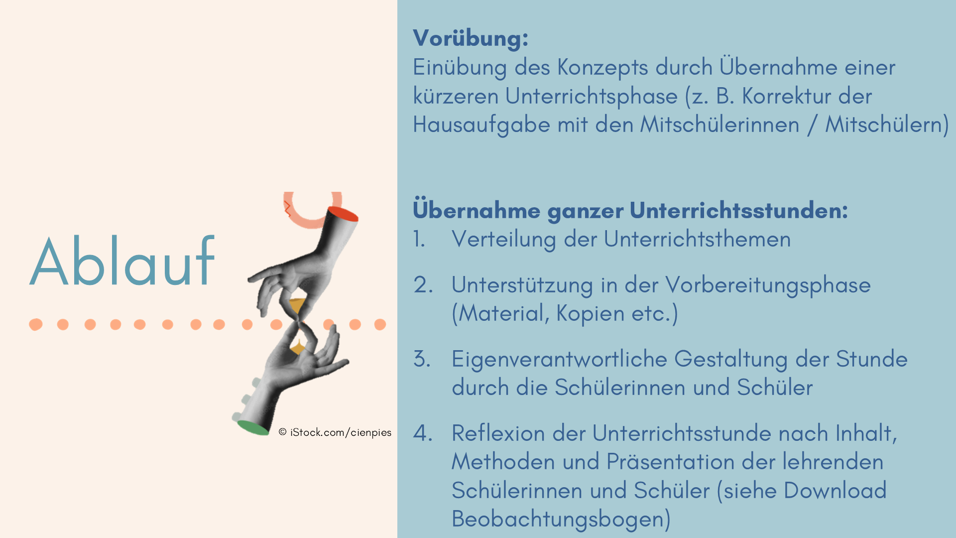 - Idealerweise zu zweit oder maximal zu dritt gestalten Schülerinnen und Schüler eine Unterrichtsphase (z. B. Einstieg in ein Thema, Wiederholung eines Themas, Korrektur der Hausaufgaben) oder eine ganze Unterrichtsstunde (siehe auch Beitrag “sprachliche und kognitive Aktivierung”).