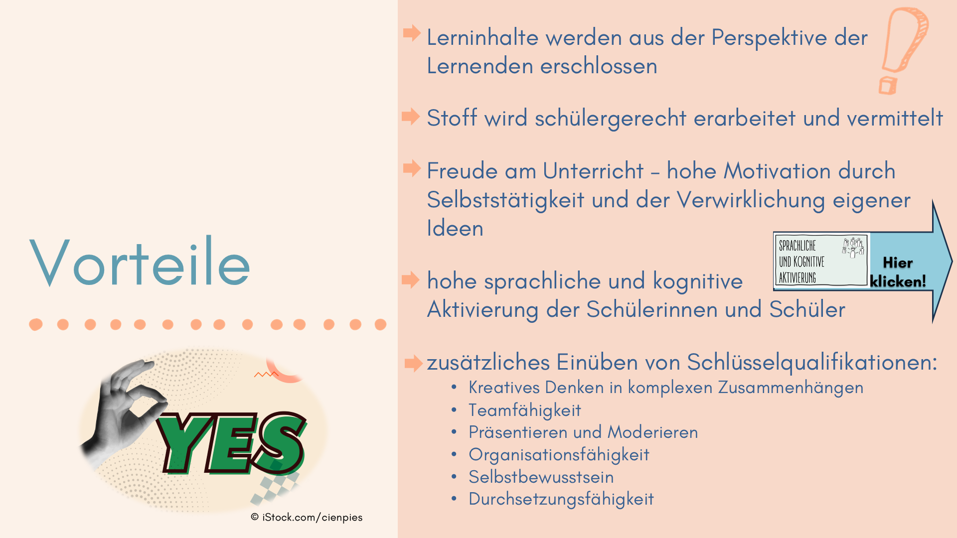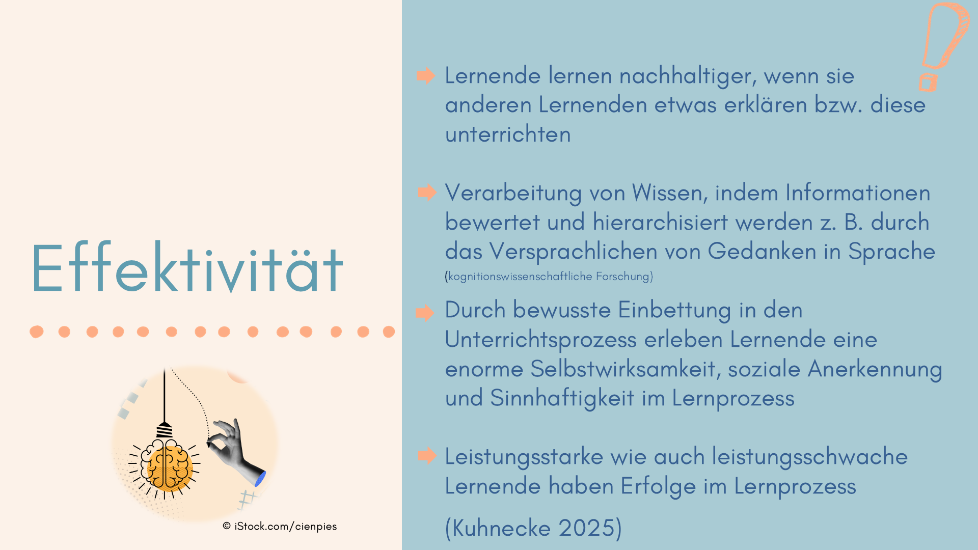 - Sie erschließen sich die Inhalte selbst, erproben Methoden und vermitteln diese ihren Mitschülerinnen und Mitschülern (Kolbe / Martin 2024).