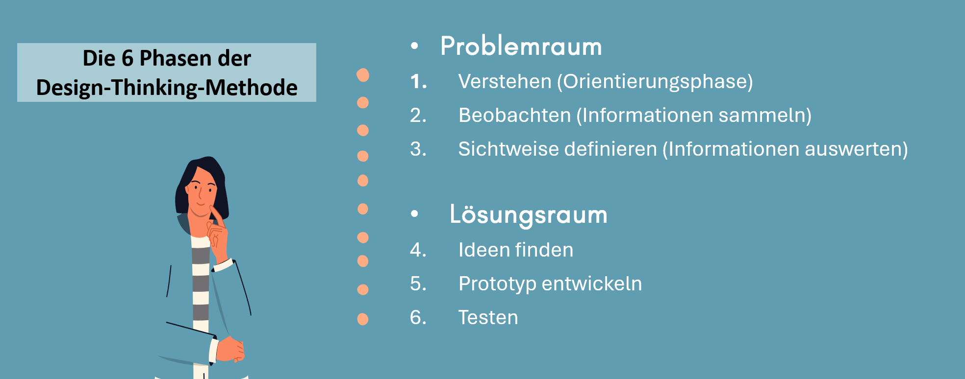 Die Methode Design-Thinking erstreckt sich in diesem Beitrag auf sechs Phasen, die sich in folgende zwei Abschnitte gruppieren lassen: