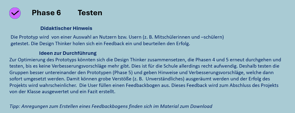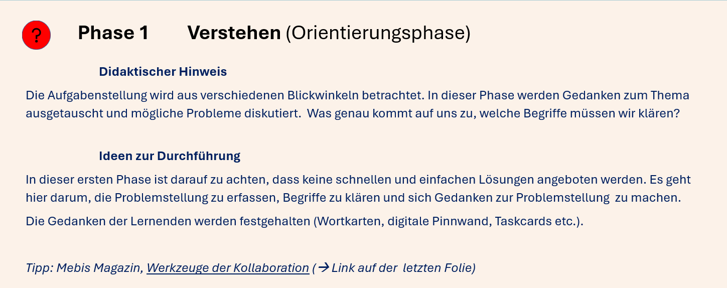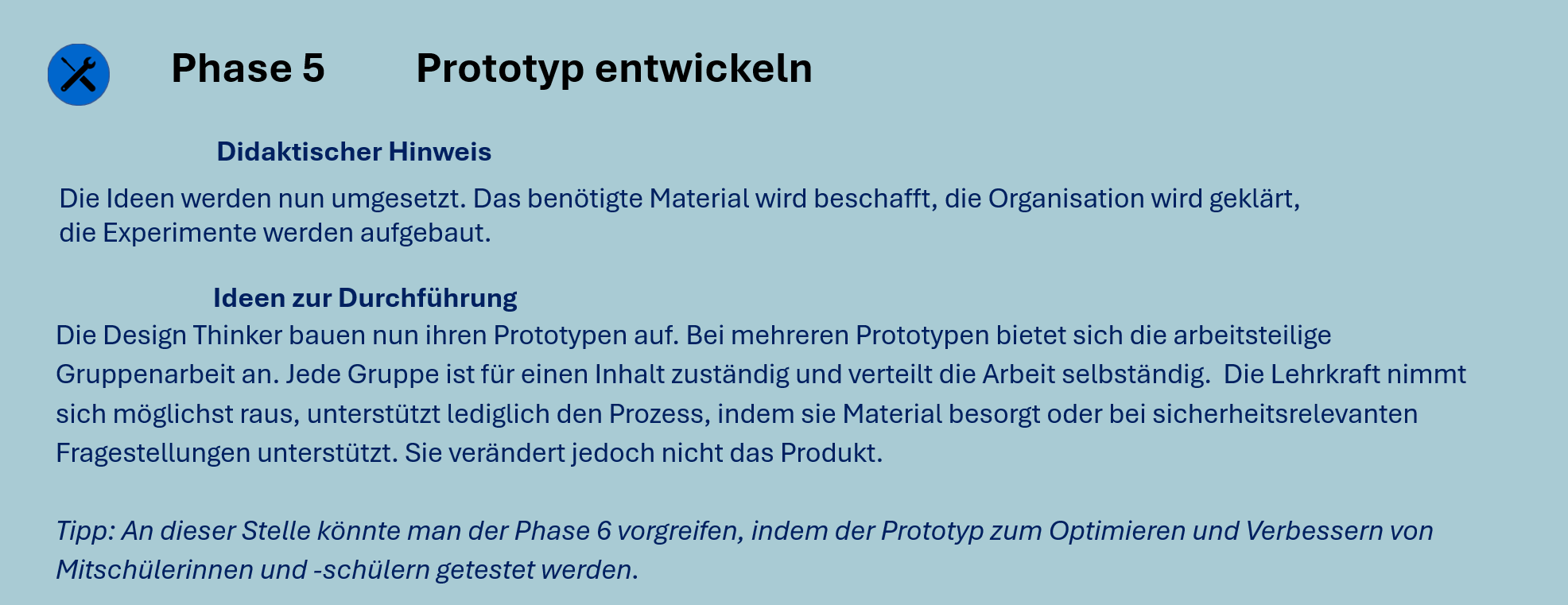 Der Problemraum nimmt also eine zentrale Rolle ein. Das Endprodukt steht noch nicht fest, die Lehrerin, der Lehrer nimmt lediglich eine beratende Rolle ein. Sie ist verantwortlich für die Schaffung einer positiven und sicheren Lernumgebung, die die Zusammenarbeit, Empathie und das Ausprobieren fördert.