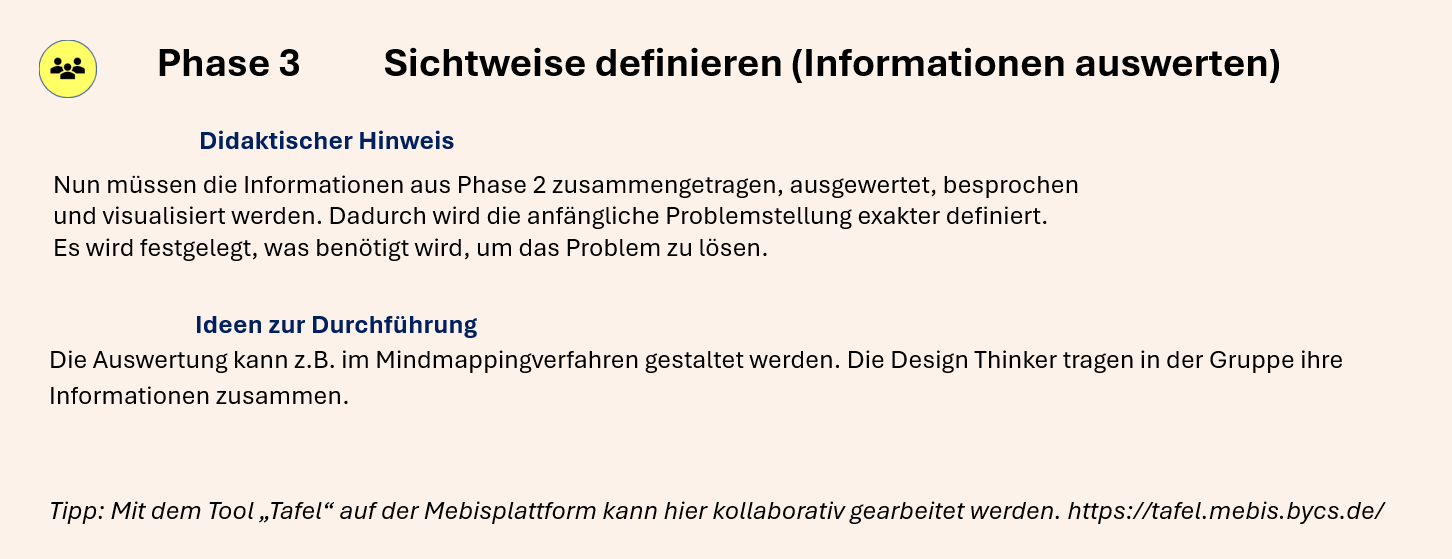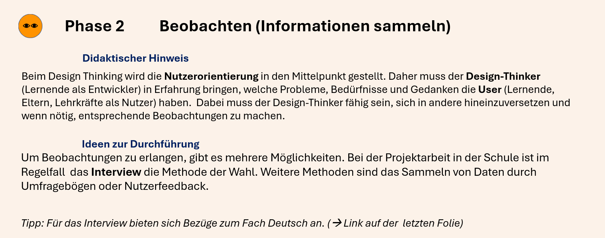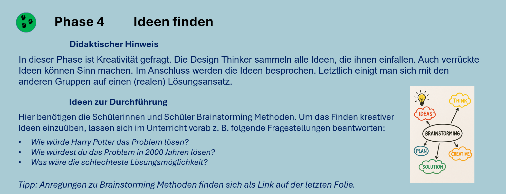 Die Siemens Stiftung schreibt in ihrem Medienportal für den MINT-Unterricht: “ „Macht die Sicht der Nutzer/-innen zu eurer Sache!“ Die Schülerinnen und Schüler sollen im ersten Schritt die Aufgabenstellung verstehen und sich in die Situation der betroffenen Zielgruppe hineinversetzen. Sie sollen deren Bedürfnisse erkennen und sich mit ihnen identifizieren. Erst nach dieser ersten wichtigen Phase erarbeiten die Gruppen Lösungsideen mithilfe von sogenanntem Prototypen”.