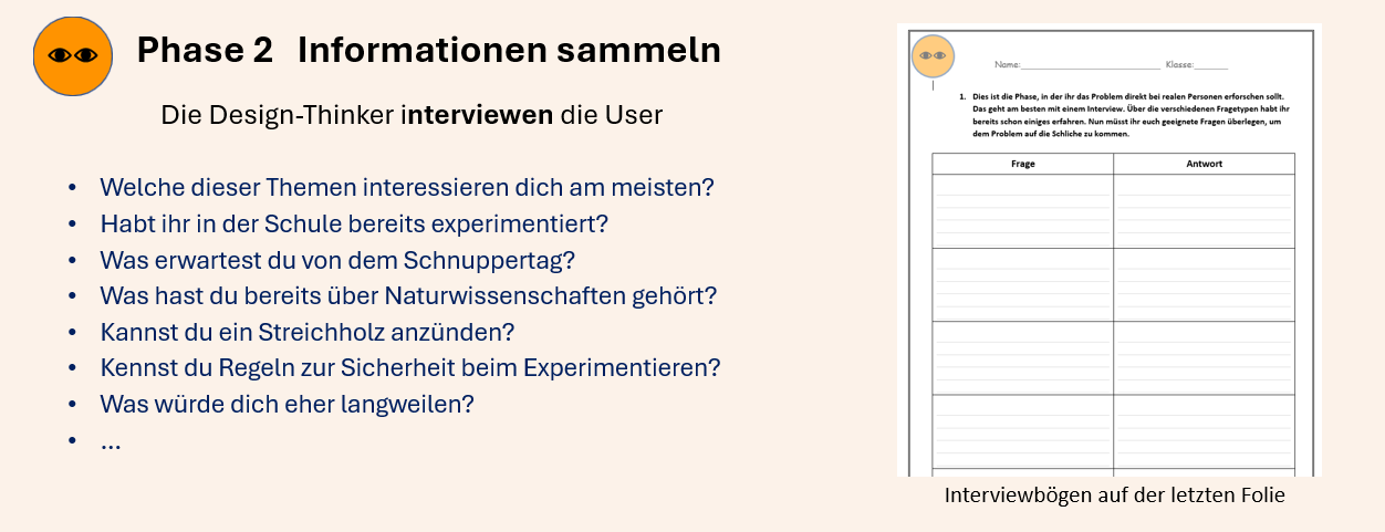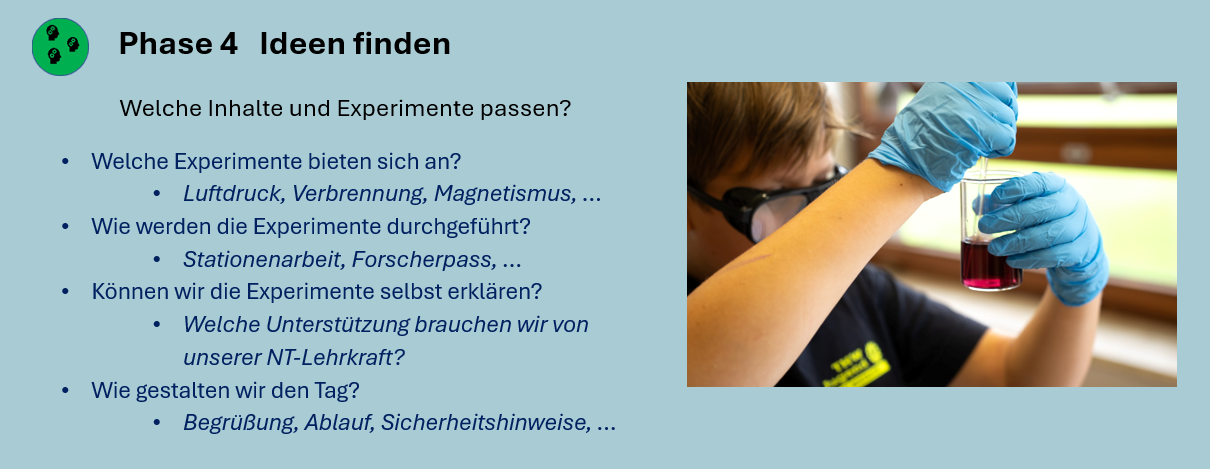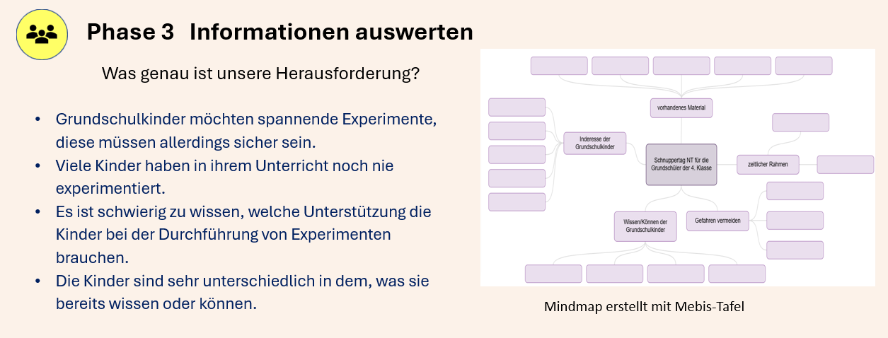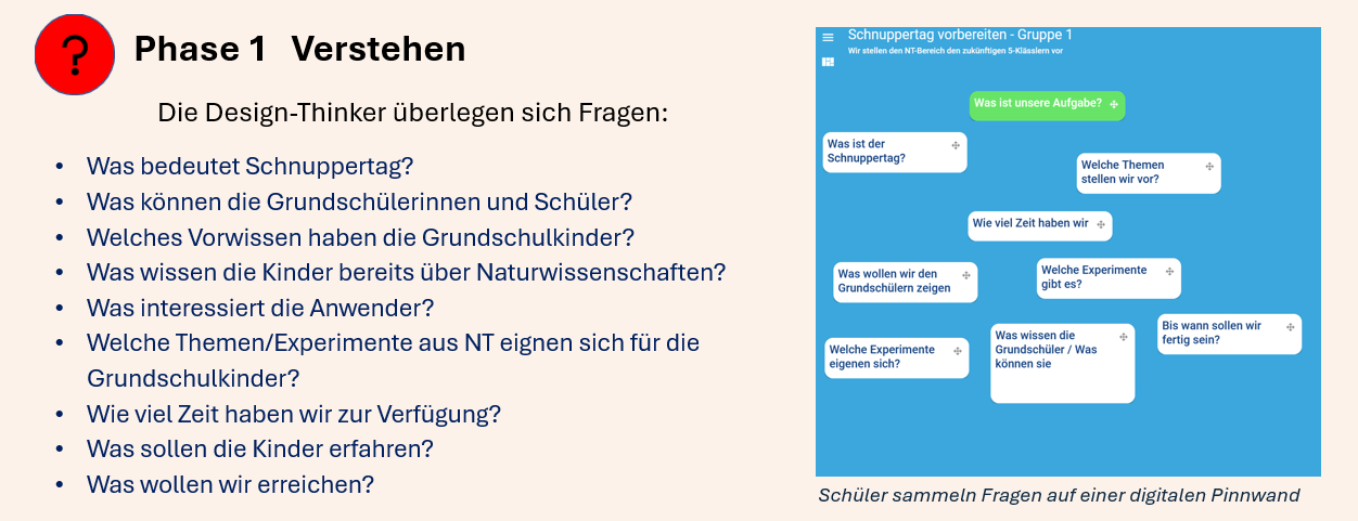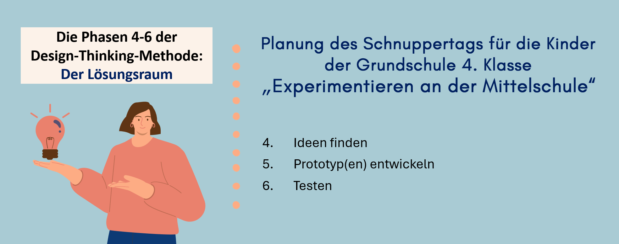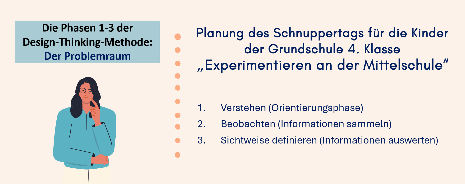 Die Schülerinnen und Schüler der 8. Klasse (Design-Thinker) planen die Vorstellung des NT-Bereichs ihrer Mittelschule mit dem Titel “Experimentieren an der Mittelschule". Dabei möchten sie sich möglichst nah an den Bedürfnissen und Interessen der Grundschulkinder (den Nutzern) orientieren.