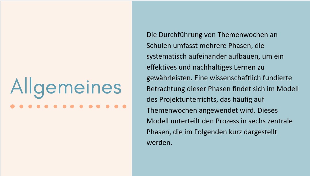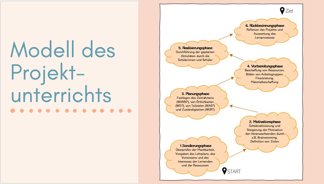 Die Planung sowie Durchführung einer Themenwoche an Schulen umfasst mehrere Phasen, die systematisch aufeinander aufbauen, um ein effektives und nachhaltiges Lernen zu gewährleisten. Eine wissenschaftlich fundierte Betrachtung dieser Phasen findet sich im Modell des Projektunterrichts, das häufig auf Themenwochen angewendet wird. Dieses Modell unterteilt den Prozess in sechs zentrale Phasen (Warwitz, Siegbert/Rudolf, Anita: Projektunterricht. Didaktische Grundlagen und Modelle, Schorndorf 1977, S. 41.):