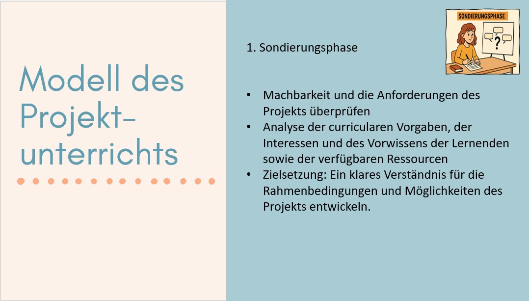 Sondierungsphase: In dieser initialen Phase werden die Anforderungen und die Machbarkeit des Projekts überprüft. Es erfolgt eine Analyse der curricularen Vorgaben, der Interessen und des Vorwissens der Lernenden sowie der verfügbaren Ressourcen. Ziel ist es, ein klares Verständnis für die Rahmenbedingungen und Möglichkeiten des Projekts zu entwickeln.