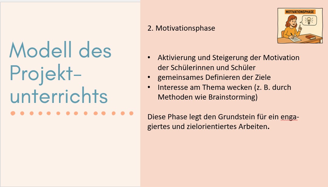 Motivationsphase: Hier steht die Aktivierung und Steigerung der Motivation der Schülerinnen und Schüler im Mittelpunkt. Durch Methoden wie Brainstorming werden gemeinsame Ziele definiert und ein starkes Interesse am Thema geweckt. Diese Phase legt den Grundstein für ein engagiertes und zielorientiertes Arbeiten.