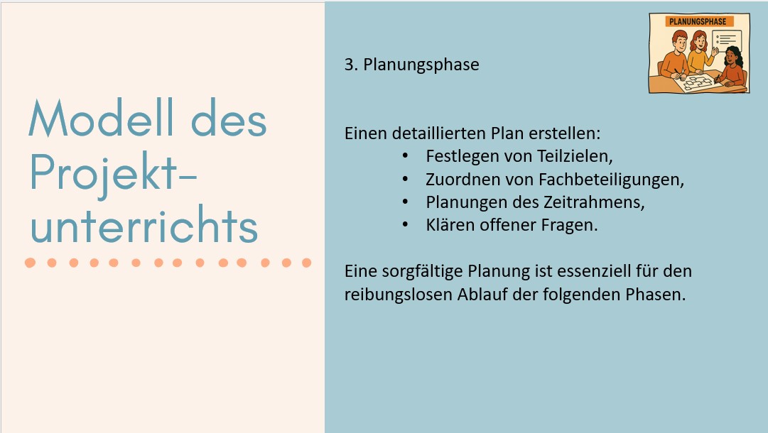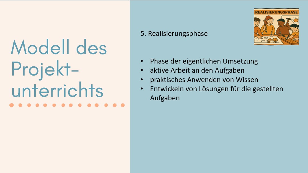 Realisierungsphase: Dies ist die Phase der eigentlichen Umsetzung, in der die geplanten Aktivitäten durchgeführt werden. Die Schülerinnen und Schüler arbeiten aktiv an ihren Aufgaben, wenden ihr Wissen praktisch an und entwickeln Lösungen für die gestellten Arbeitsaufträge.