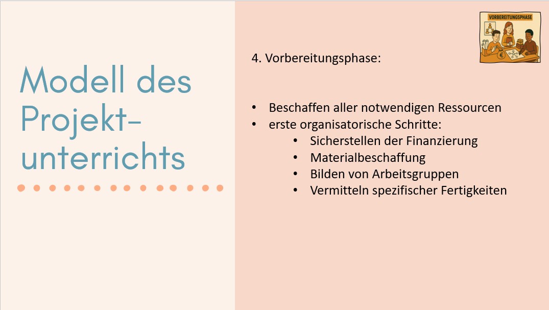 Vorbereitungsphase: In dieser Phase werden alle notwendigen Ressourcen beschafft und organisatorische Schritte unternommen. Dazu gehören die Sicherstellung der Finanzierung, die Materialbeschaffung, die Bildung von Arbeitsgruppen und die Vermittlung spezifischer Fertigkeiten, die für die Projektdurchführung erforderlich sind.