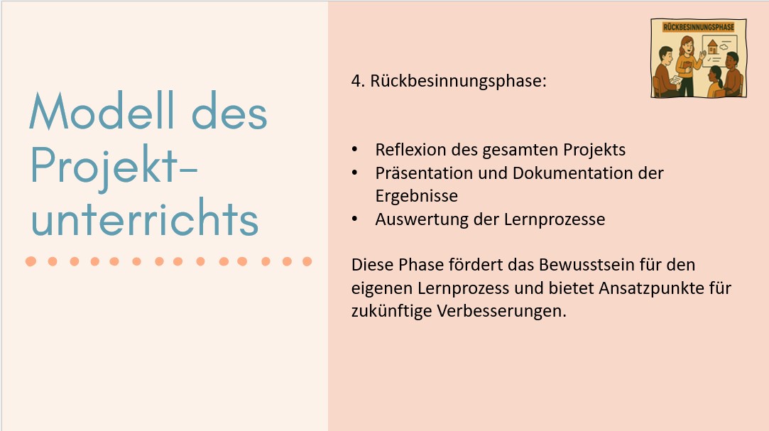 Rückbesinnungsphase: Abschließend erfolgt eine Reflexion des gesamten Projekts. Die Ergebnisse werden dokumentiert und präsentiert. Es findet eine Auswertung der Lernprozesse statt, bei der sowohl Erfolge als auch Herausforderungen analysiert werden. Diese Phase fördert das Bewusstsein für den eigenen Lernprozess und bietet Ansatzpunkte für zukünftige Verbesserungen.