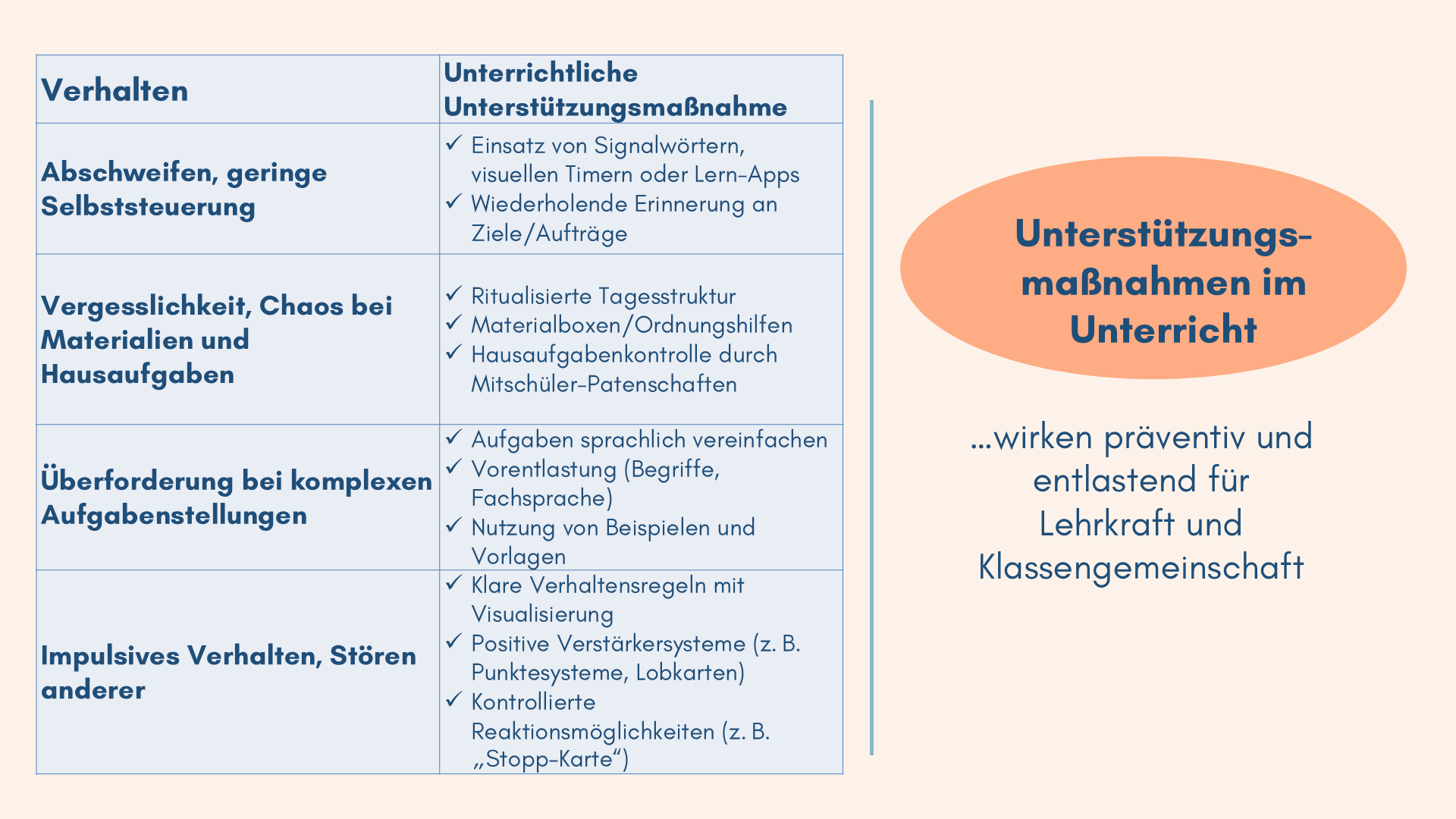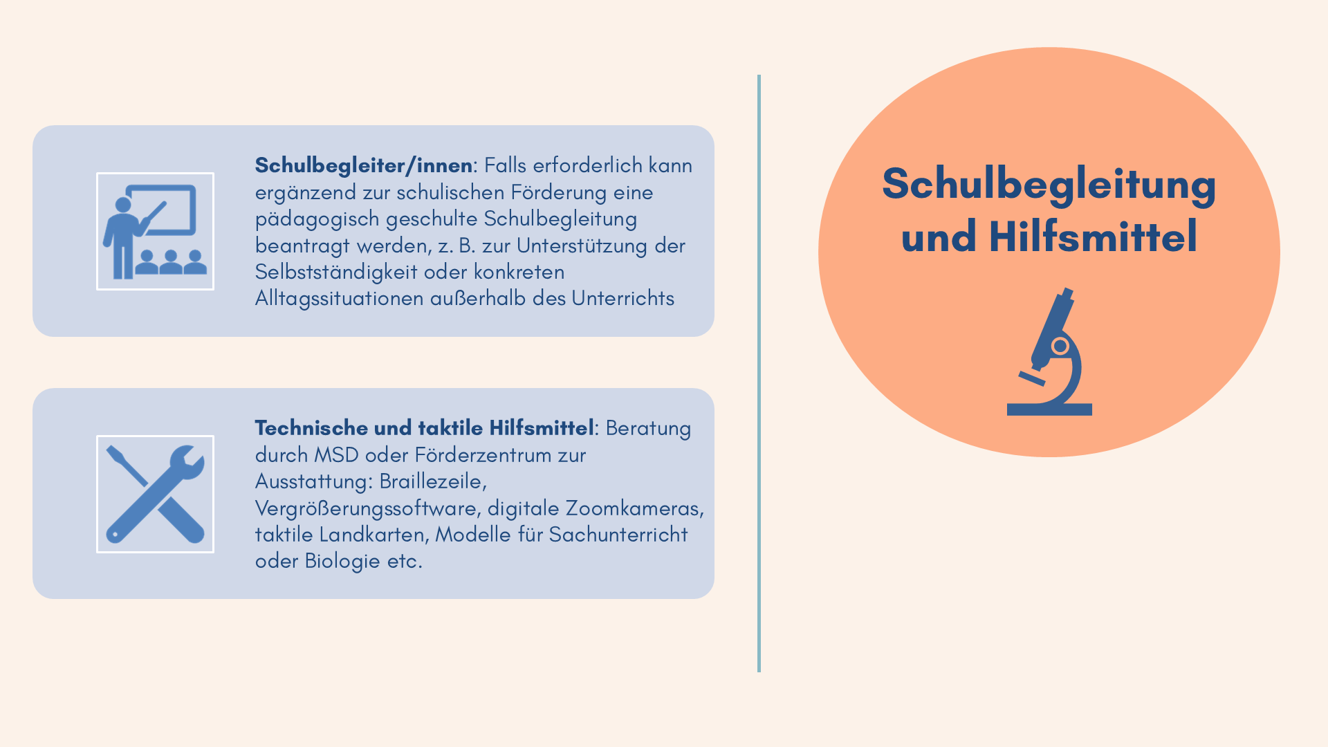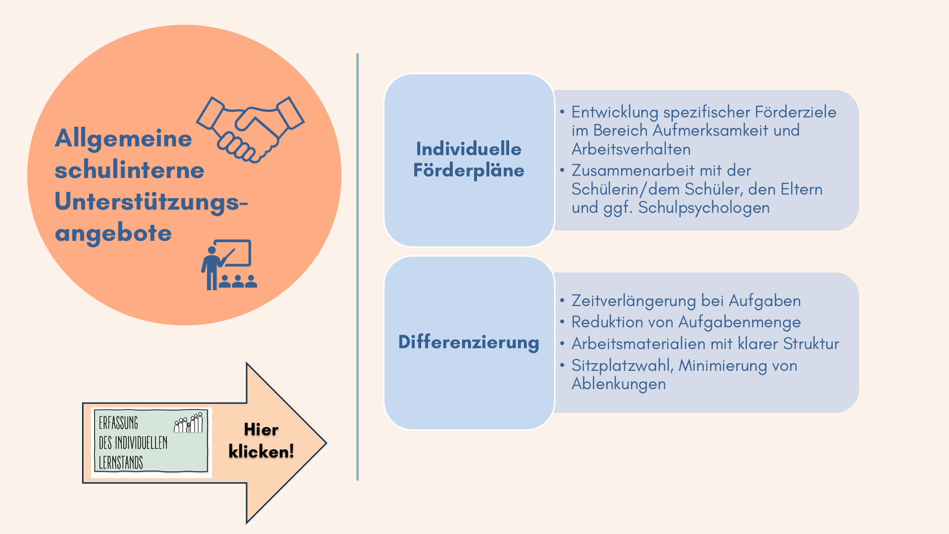 Im Folgenden sind zu den Entwicklungsbereichen Lernen, Konzentration, Sprache, Sozialverhalten, Hören sowie weiteren Entwicklungsbereichen (Sehen, Motorik, geistige Entwicklung) jeweils Maßnahmen für die schulische und außerschulische Förderung und Unterstützung aufgeführt: