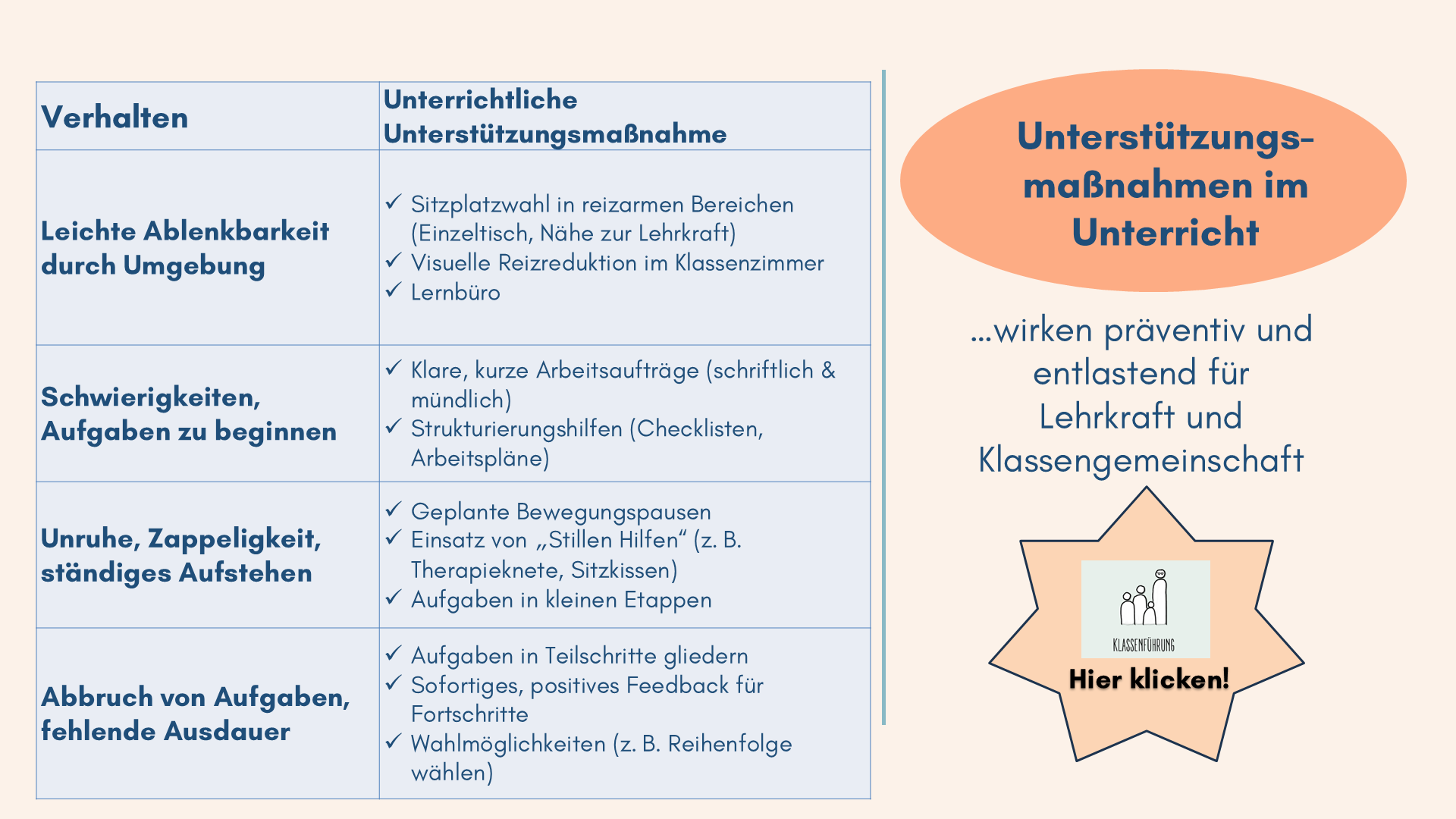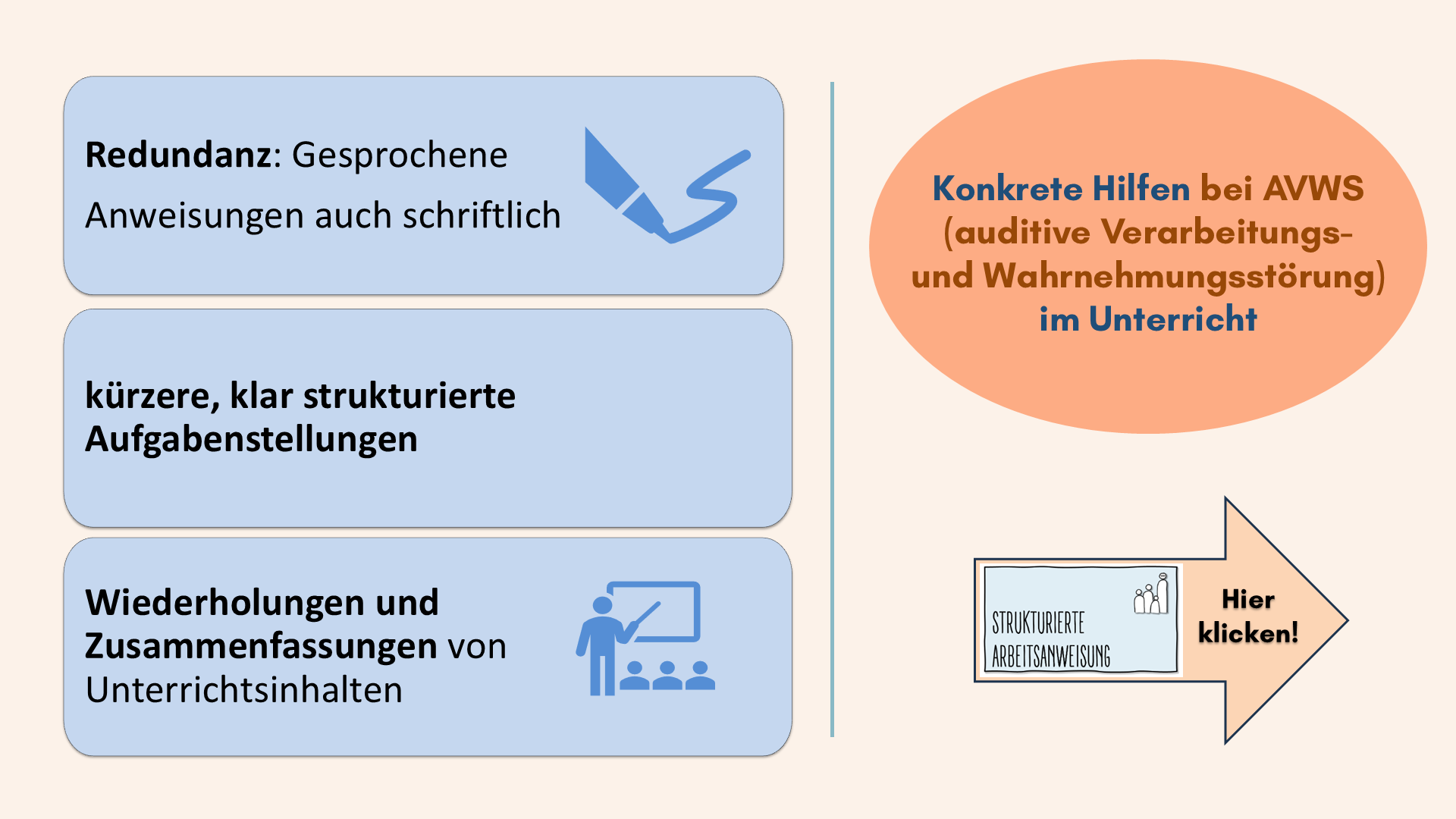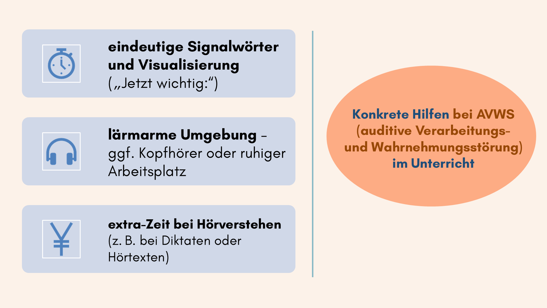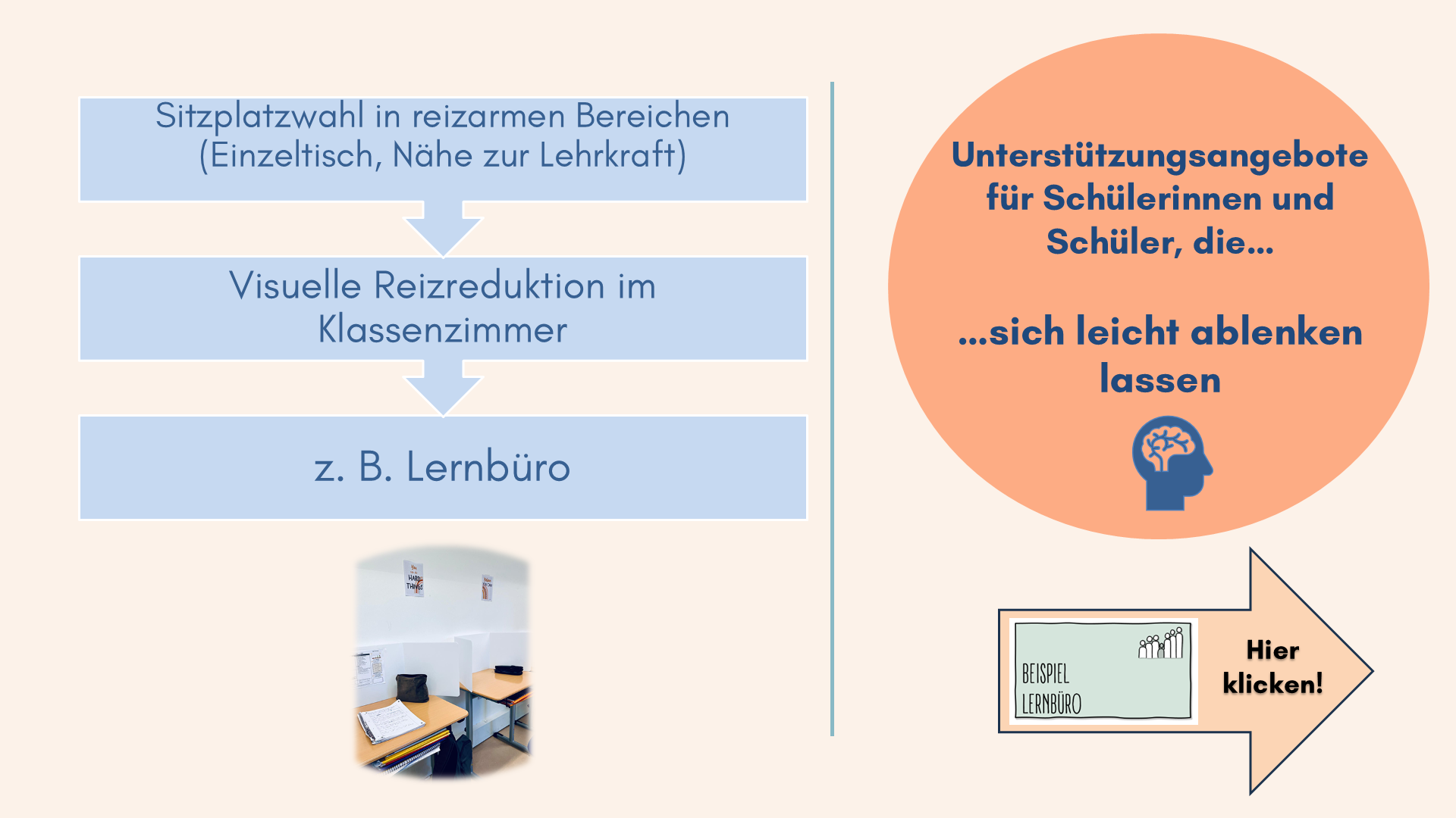 Im Folgenden sind zu den Entwicklungsbereichen Lernen, Konzentration, Sprache, Sozialverhalten, Hören sowie weiteren Entwicklungsbereichen (Sehen, Motorik, geistige Entwicklung) jeweils Maßnahmen für die schulische und außerschulische Förderung und Unterstützung aufgeführt: