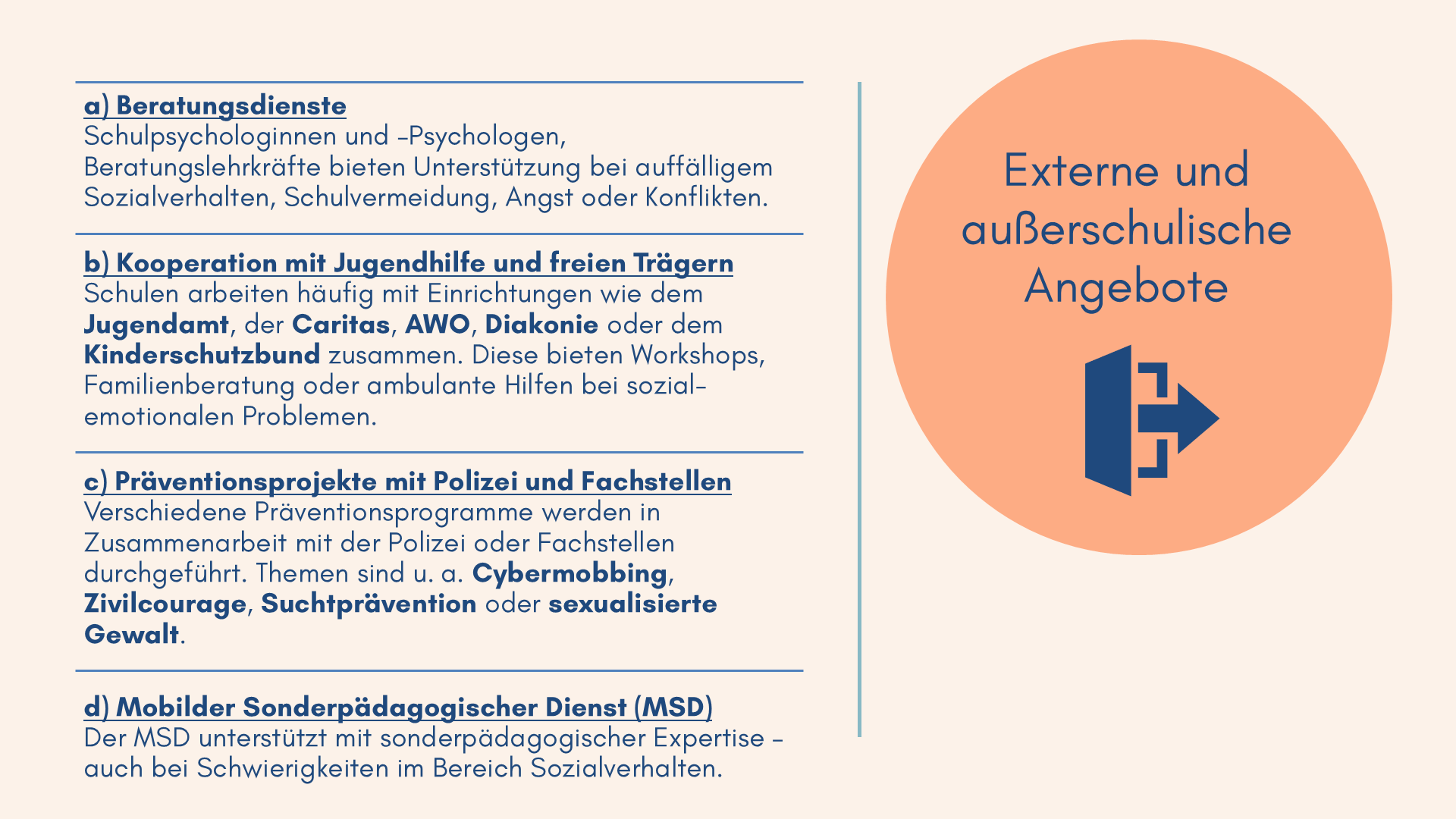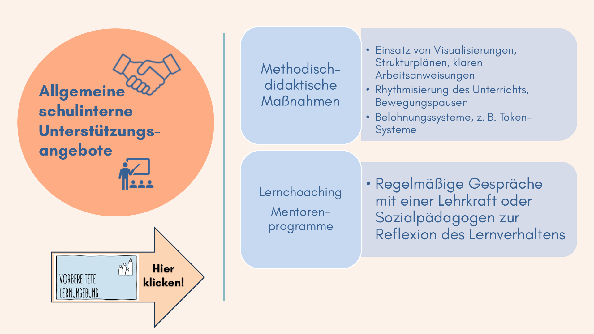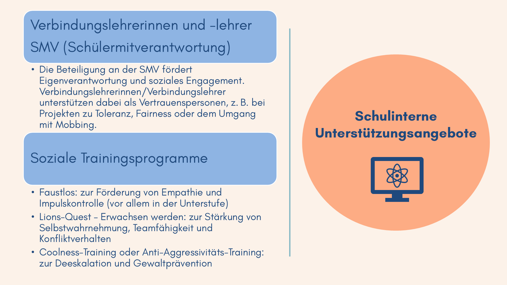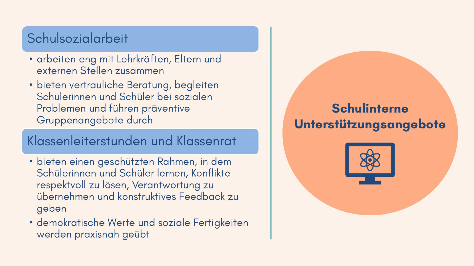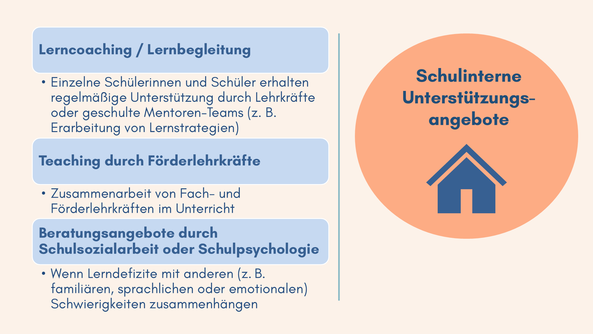Schülerinnen und Schülern benötigen – orientiert an ihren Stärken und Schwächen – in unterschiedlichen Entwicklungsbereichen Unterstützung und gezielte Förderung. Die entwicklungsförderlichen Unterstützungsangebote können je nach Bedarf allgemein für die gesamte Klasse oder gezielt für einzelne Schülerinnen oder Schüler sowohl im Rahmen des Unterrichts als auch klassenübergreifend oder außerhalb der Schule realisiert werden.