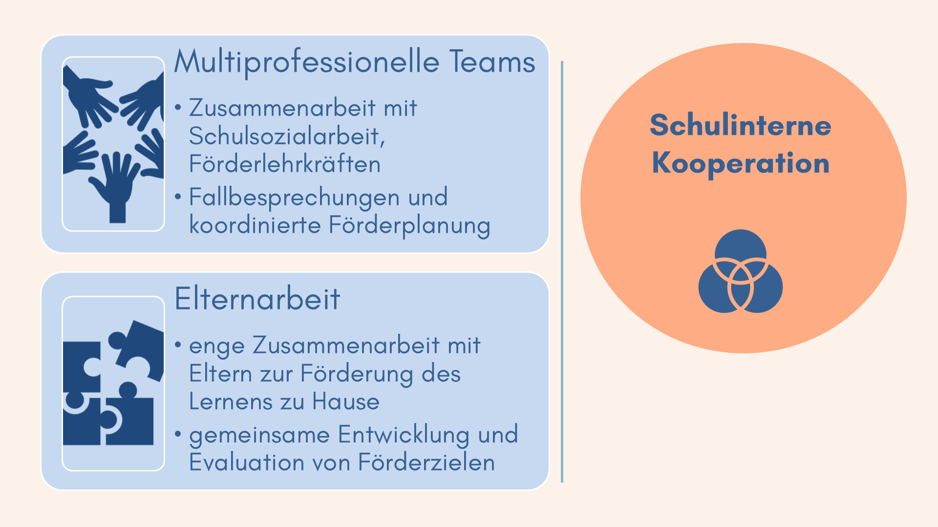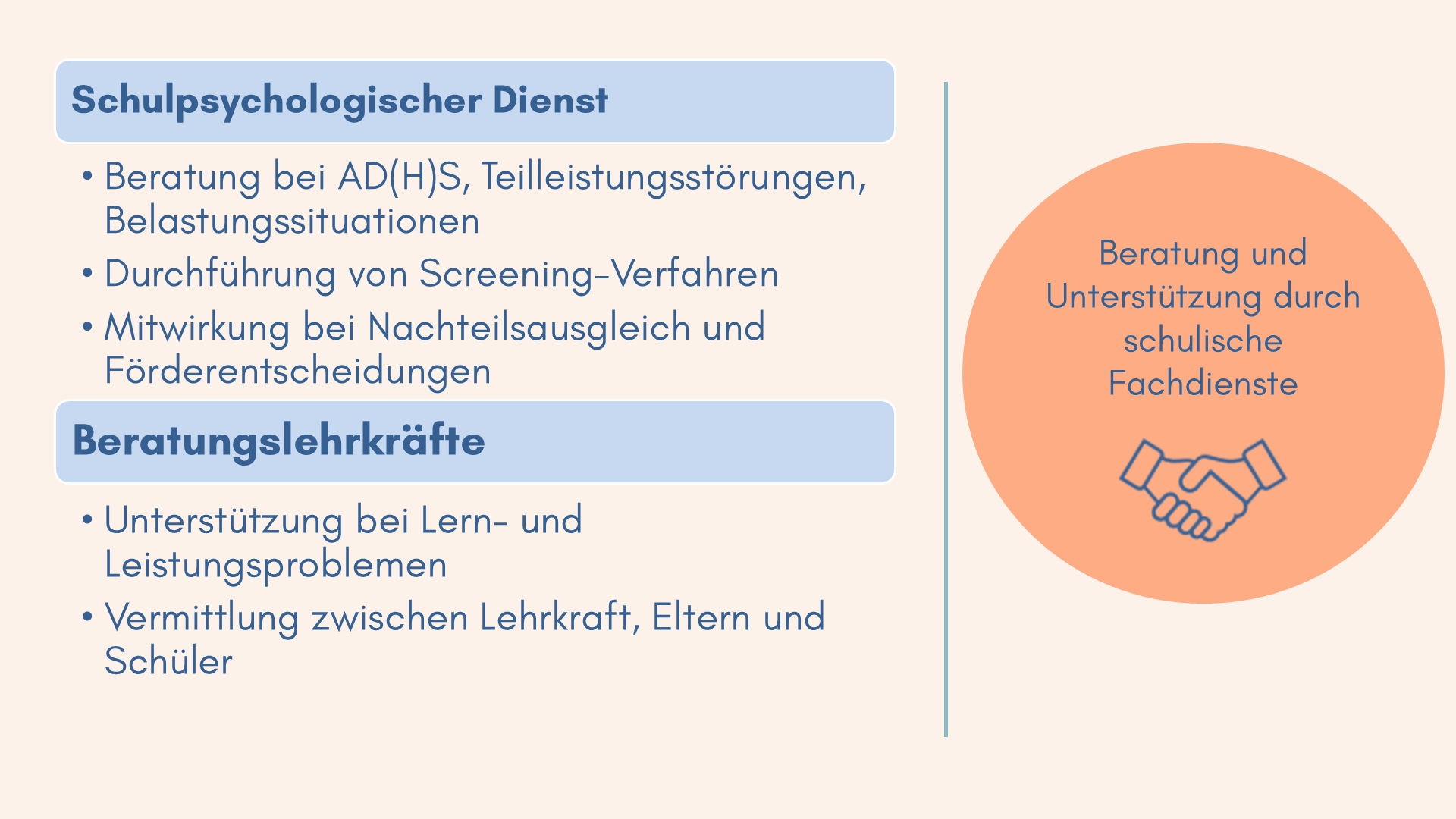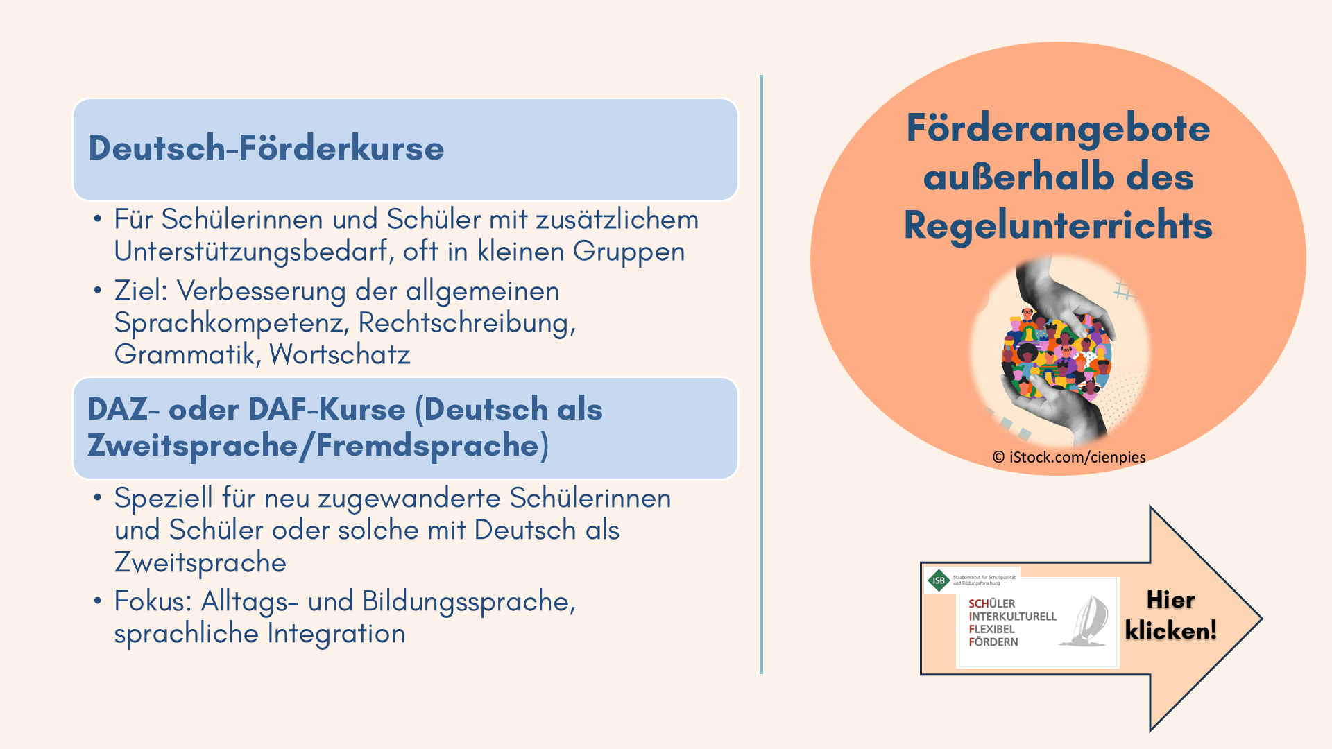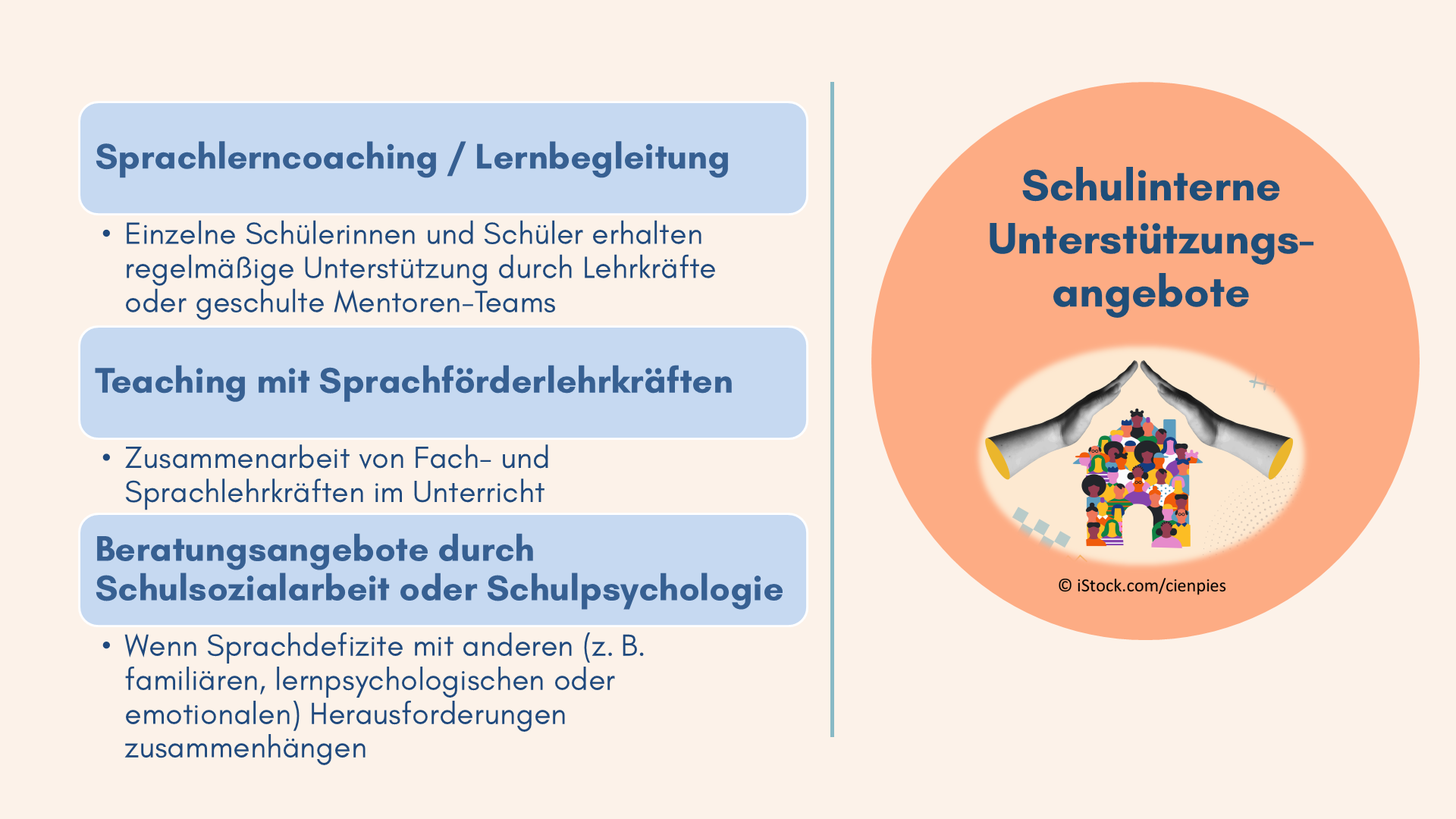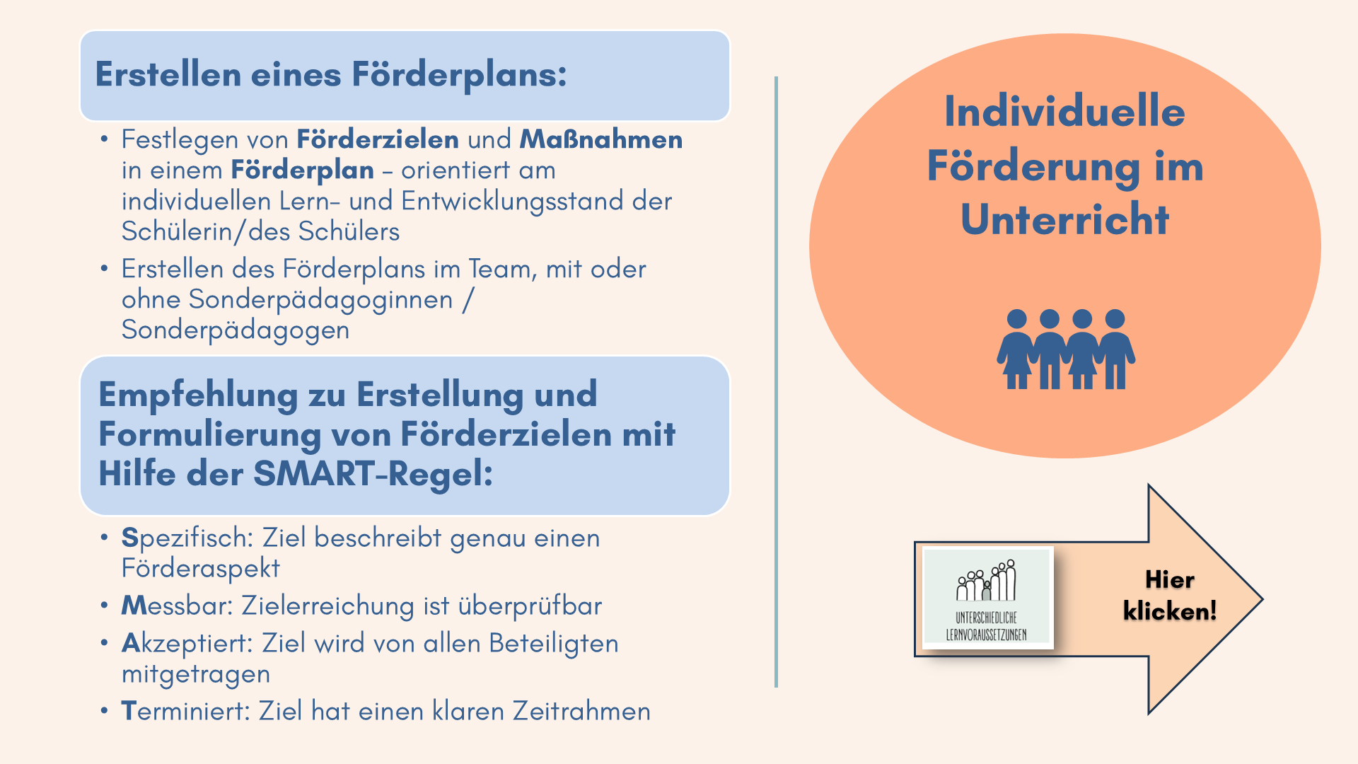 Schülerinnen und Schülern benötigen – orientiert an ihren Stärken und Schwächen – in unterschiedlichen Entwicklungsbereichen Unterstützung und gezielte Förderung. Die entwicklungsförderlichen Unterstützungsangebote können je nach Bedarf allgemein für die gesamte Klasse oder gezielt für einzelne Schülerinnen oder Schüler sowohl im Rahmen des Unterrichts als auch klassenübergreifend oder außerhalb der Schule realisiert werden.