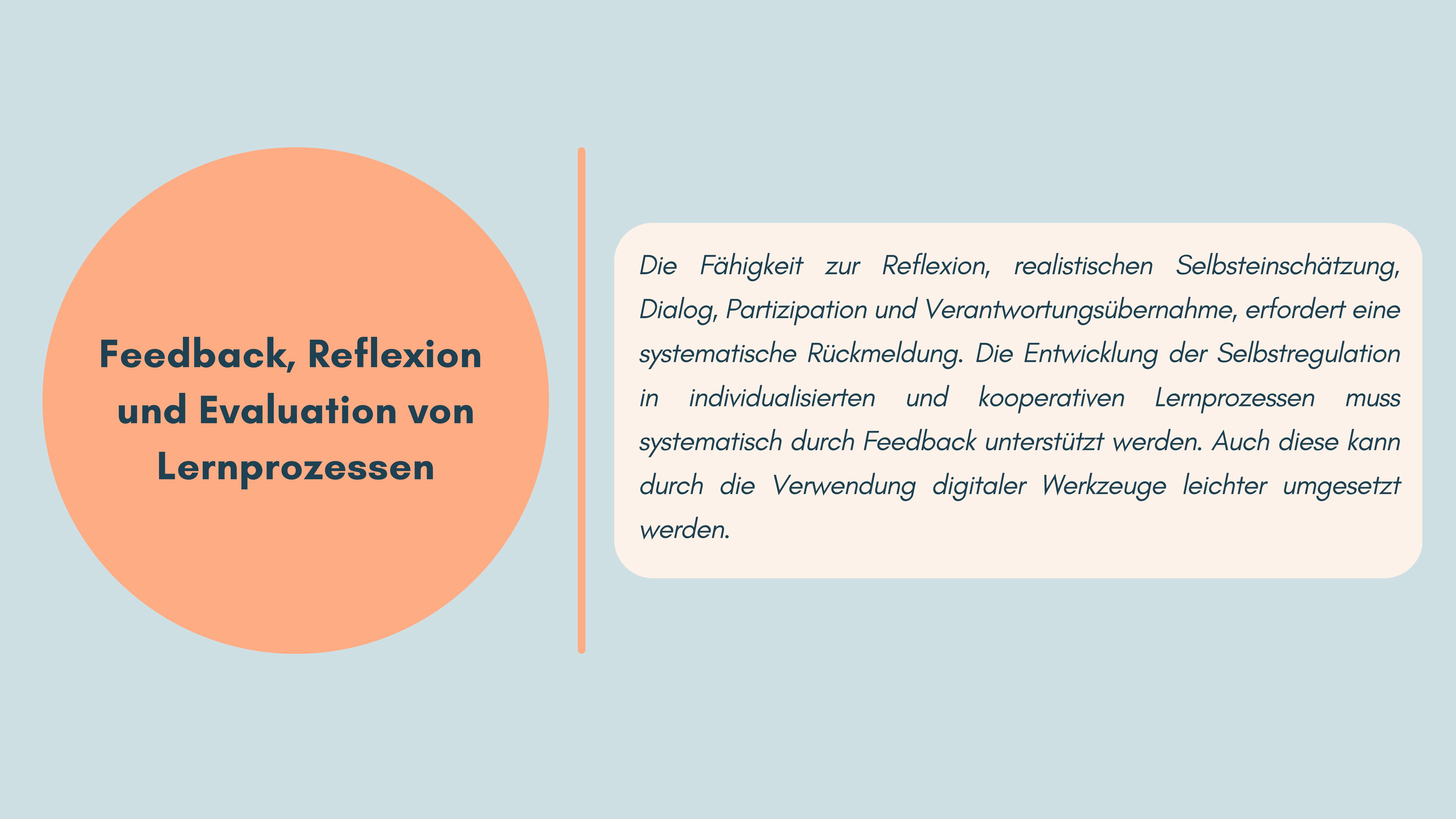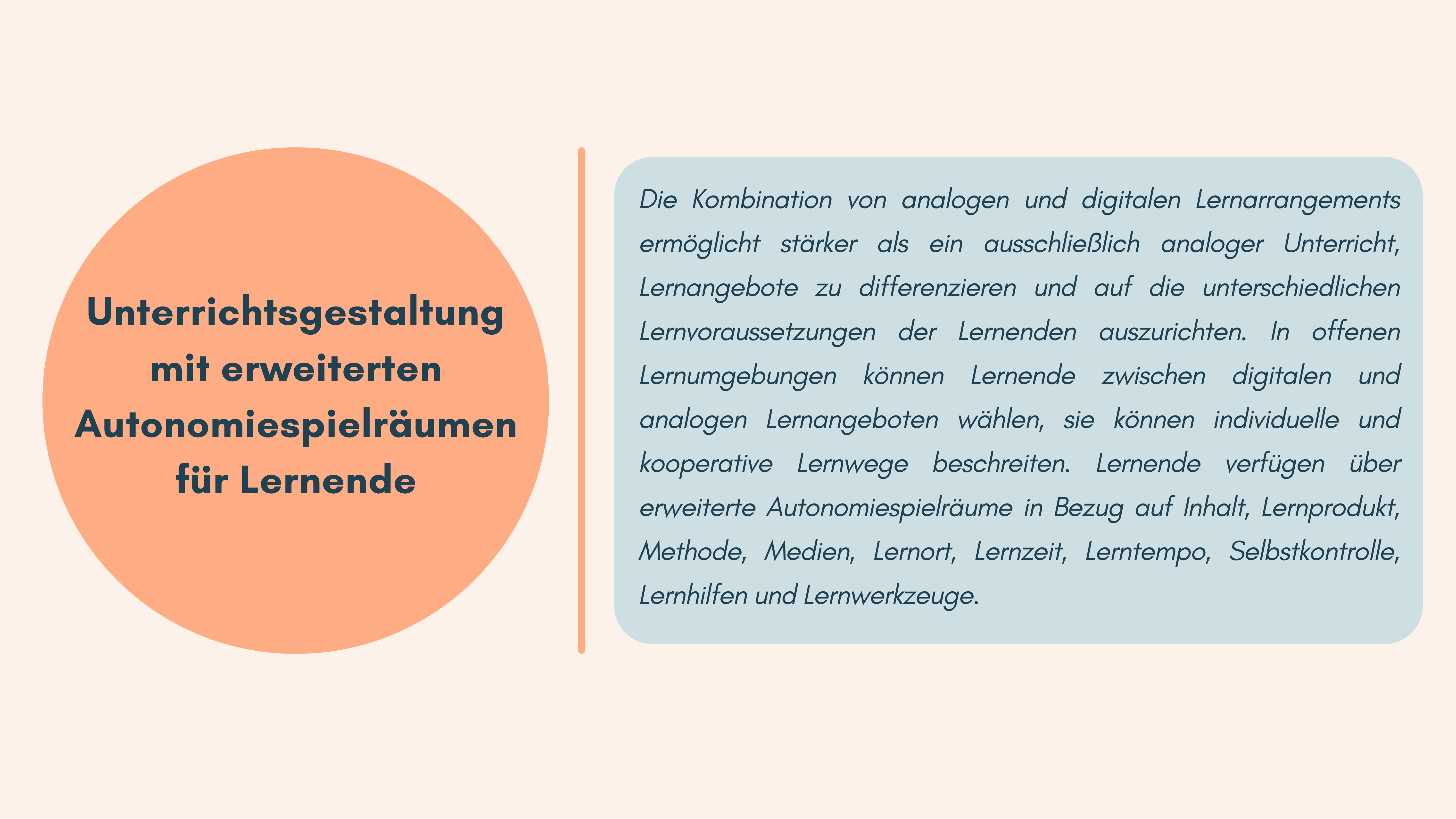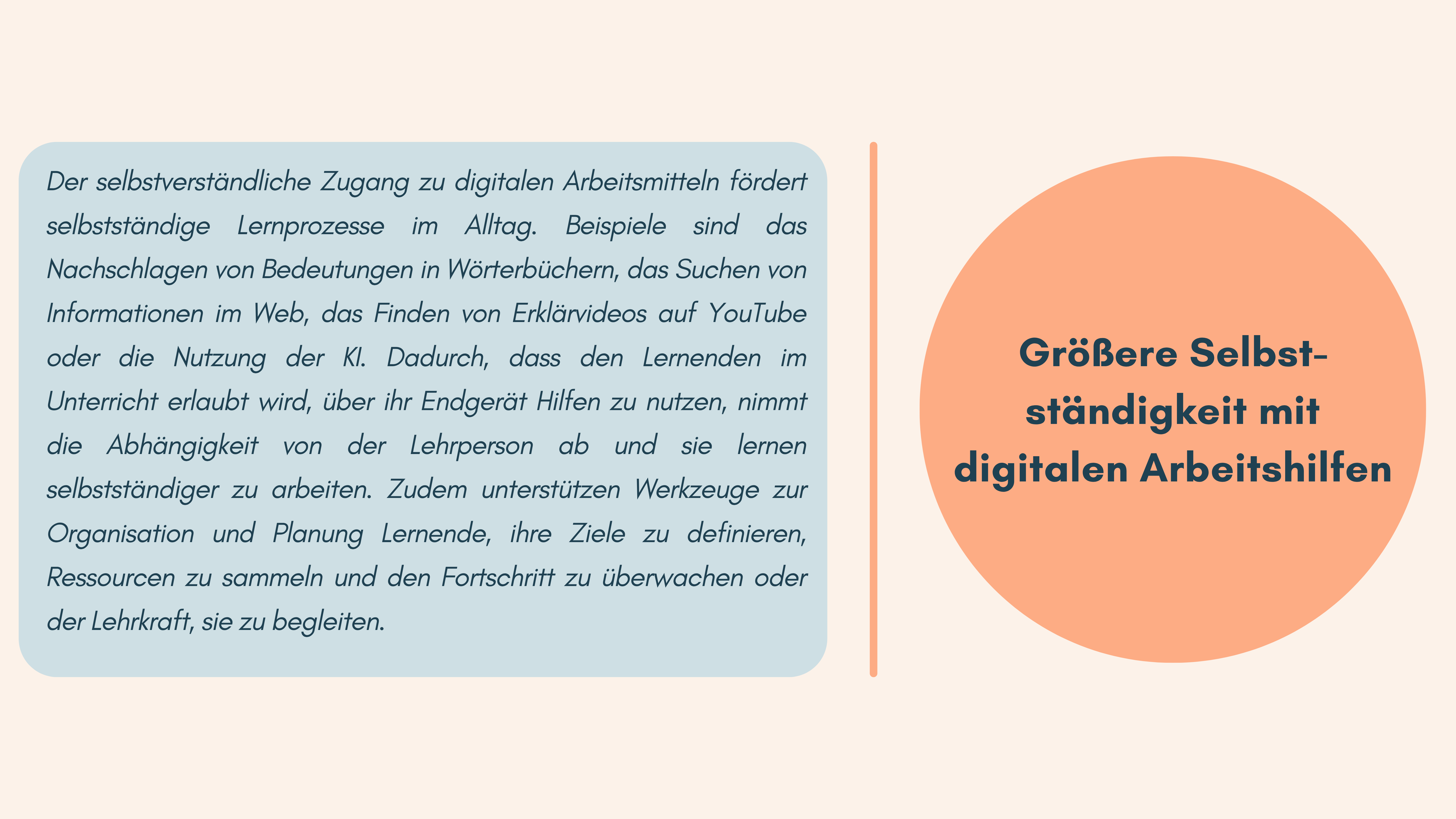 Im digital gestützten Unterricht werden Schülerinnen und Schüler durch lernförderliche Unterstützungsangebote in ihrem individuellen Lernprozess begleitet. Die dadurch ermöglichte selbstorganisierte Bearbeitung von Inhalten und Aufgaben fördert ihre Autonomie und befähigt sie, den Lernprozess zunehmend selbstständig zu steuern.