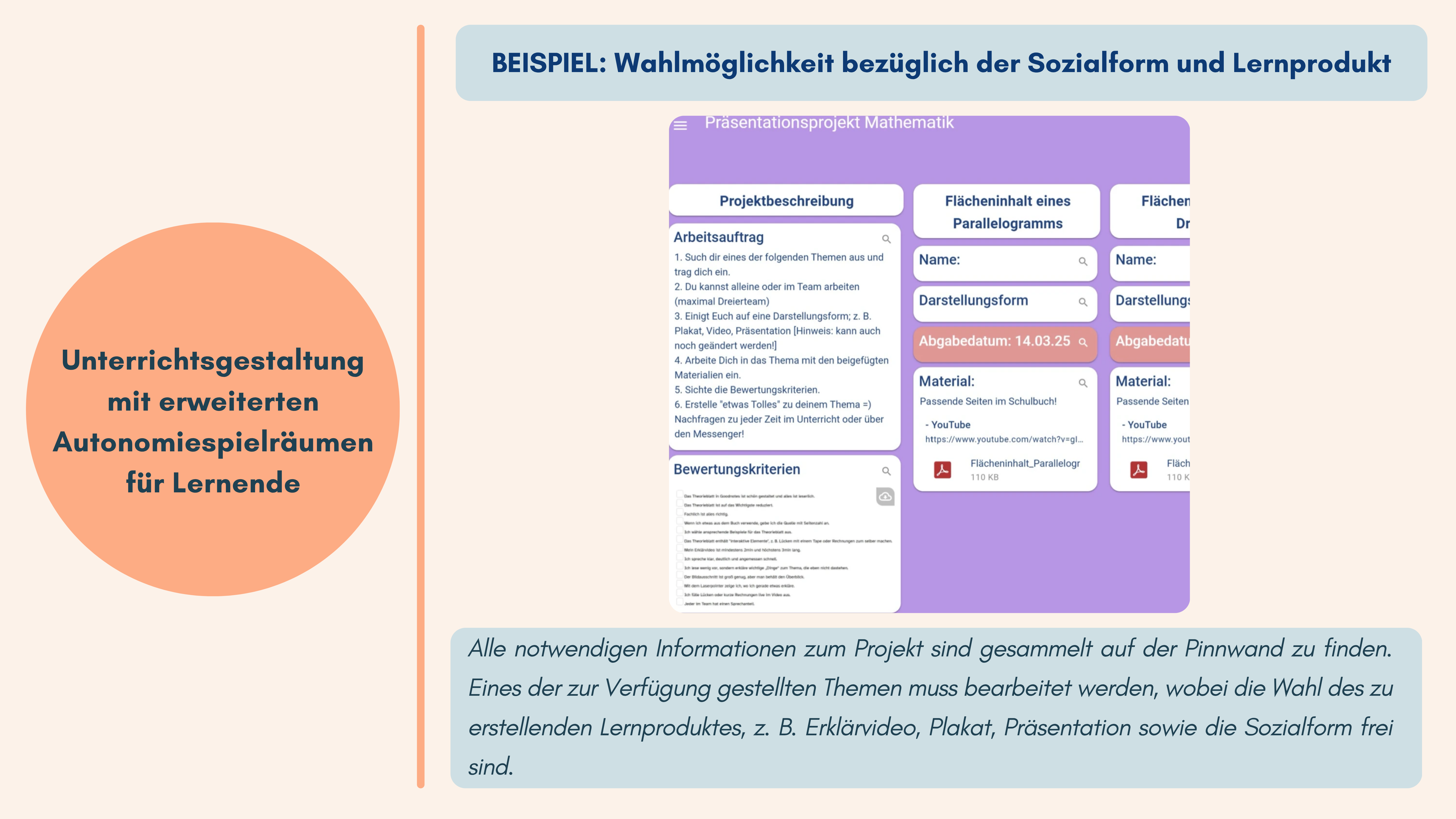 - eine Unterrichtsgestaltung, die individuelle Lernvoraussetzungen berücksichtigt und den Lernenden bis zu einem gewissen Maß Wahlfreiheit sowie Autonomie einräumt.