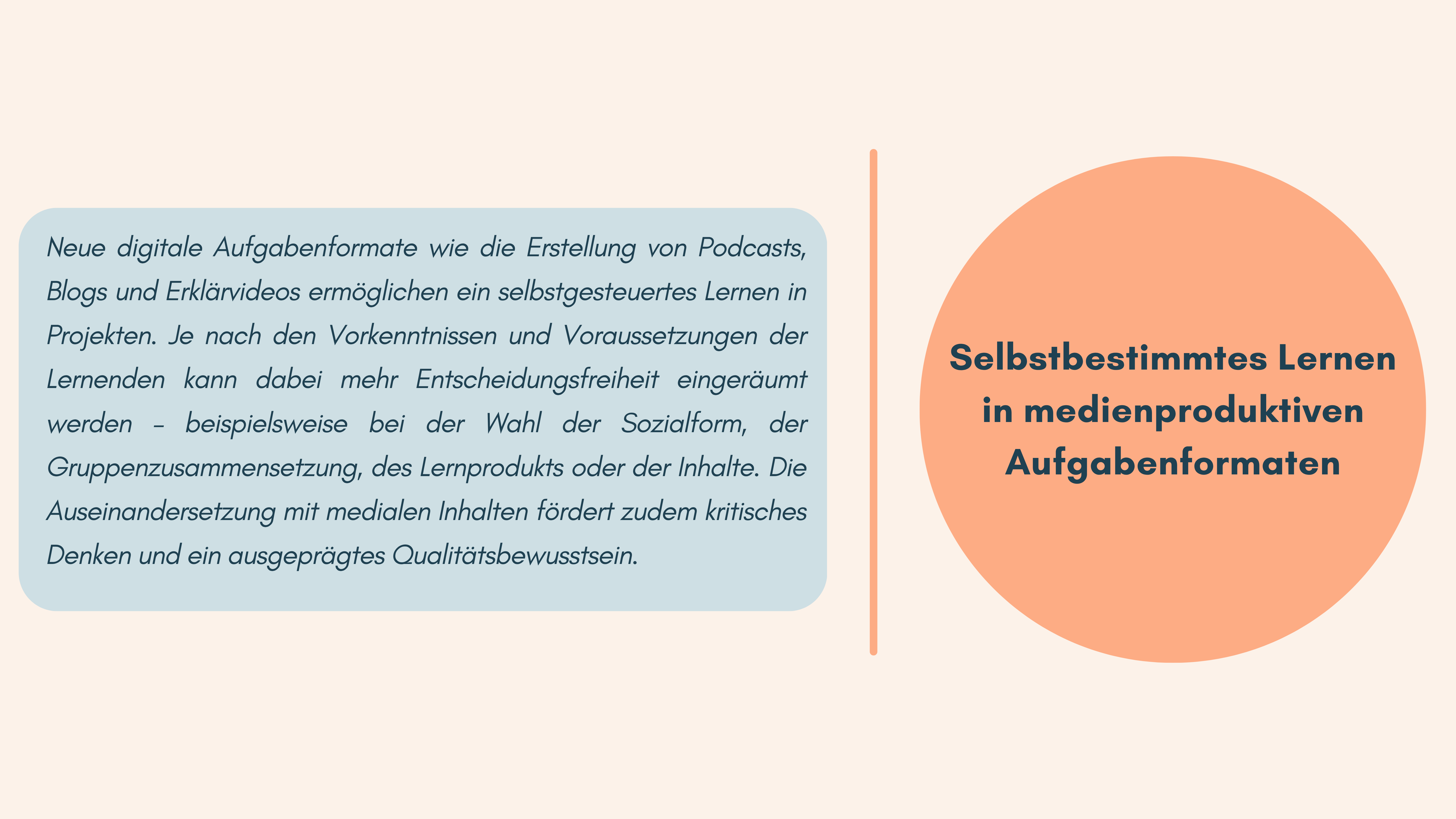- die Förderung von selbstgesteuertem Lernen in Projekten durch digitale Aufgabenformate wie z. B. die Erstellung von Podcasts, Blogs und Erklärvideos.