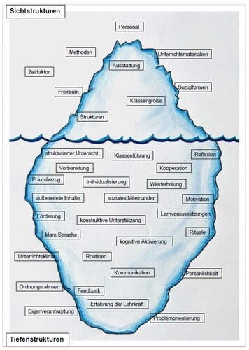 Damit werden alle Phänomene des Unterrichts in einen doppelten Blick genommen: Es erfolgt die Unterscheidung von Sichtstrukturen (oberhalb der Wasseroberfläche) und Tiefenstrukturen (unterhalb der Wasseroberfläche).