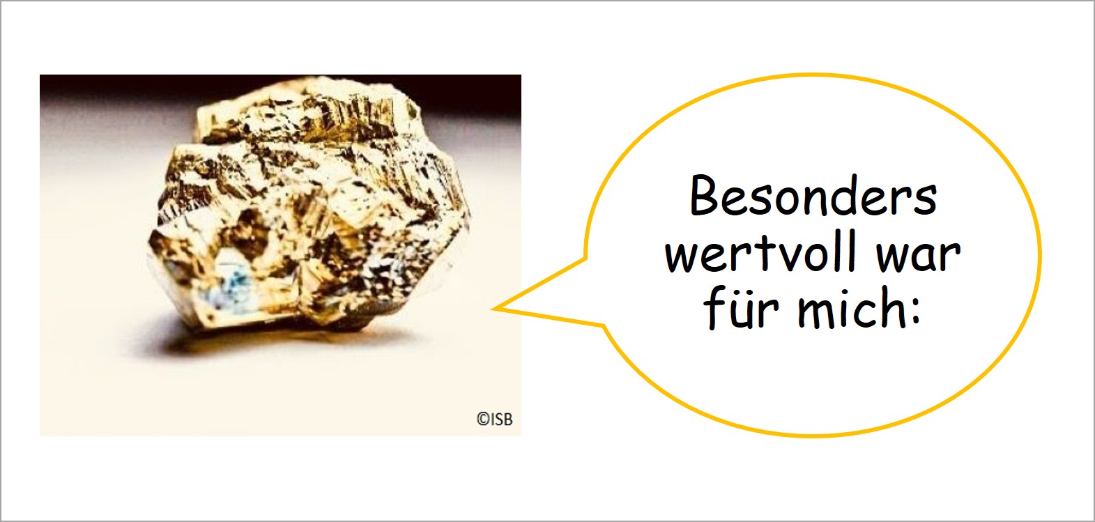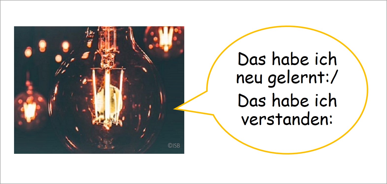 In einer Blitzlichtrunde formulieren die Schülerinnen und Schüler, was in der Stunde entdeckt wurde, was gelernt wurde, was leicht/schwer gefallen ist.