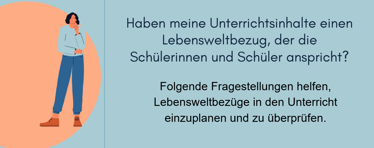 Was für eine Lerngruppe einen hohen Lebensweltbezug hat, kann bei einer anderen Gruppe einen sehr geringen haben. Die gelingende Anknüpfung an Lebensweltbezüge im Unterricht liegt daher stets in der Verantwortung der Lehrkraft. Hierbei hilft eine positive emotionale Bindung zwischen ihr und der Lerngruppe. Es ist unbedingt erforderlich, das Vorwissen der Lerngruppe bezüglich eines neuen Themas abzufragen oder im Unterrichtsgespräch zu erörtern.
