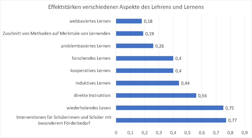 Diese exemplarischen Punkte zeigen auf, dass der direkten Instruktion, dem wiederholenden Lernen und der Intervention für Schülerinnen und Schüler mit spezifischen Lernvoraussetzungen ein größerer Stellenwert als bisher getan zugeschrieben werden sollte. Die Positionen verschiedener Bildungswissenschaftler ähneln sich in ihren Folgerungen denen aus der Hattie-Studie.