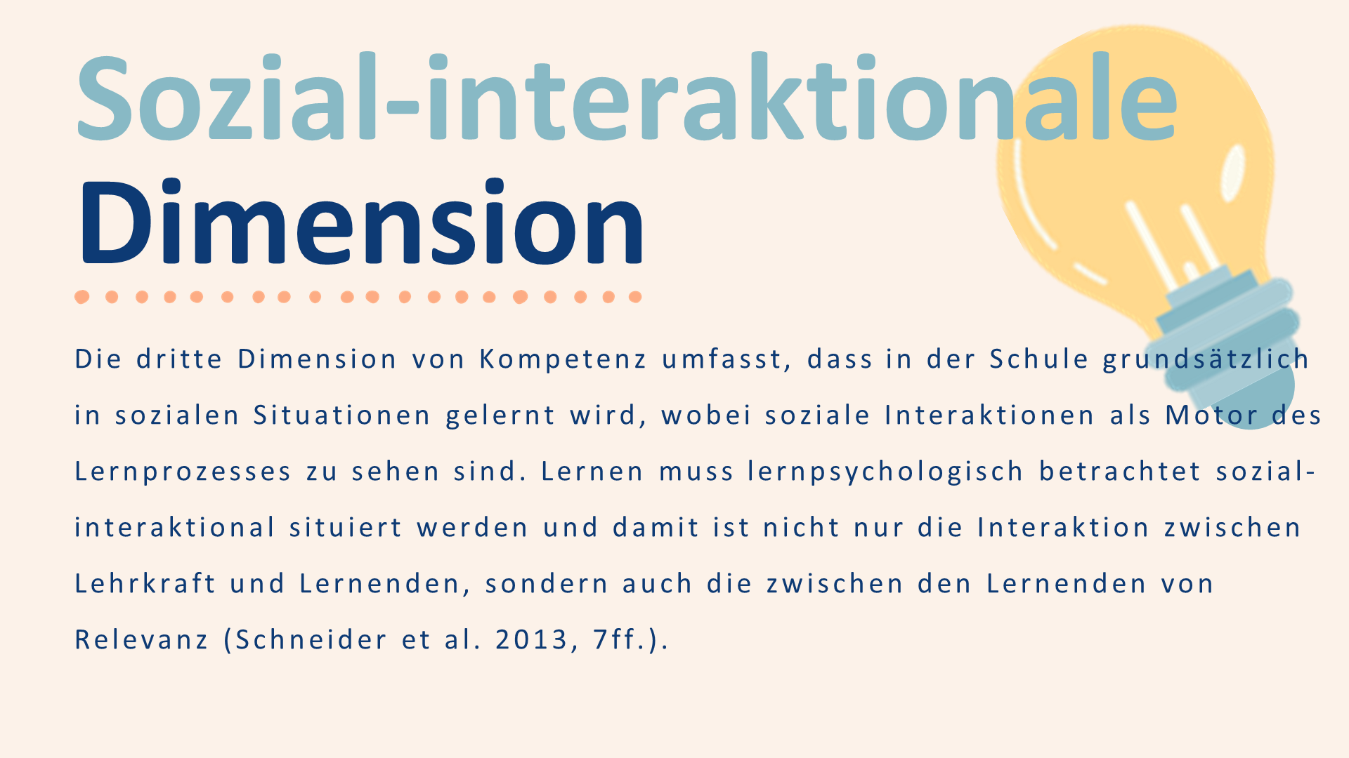 Die Diskussion um Kompetenzorientierung im deutschen Sprachraum fußt favorisiert auf einem Modell von Kompetenz nach Weinert (2001). Weinert spricht sich für einen dreidimensionalen Zugang zum Verständnis von Kompetenz aus. Diese Dimensionen lassen sich auf die Auswahl von Methoden übertragen.