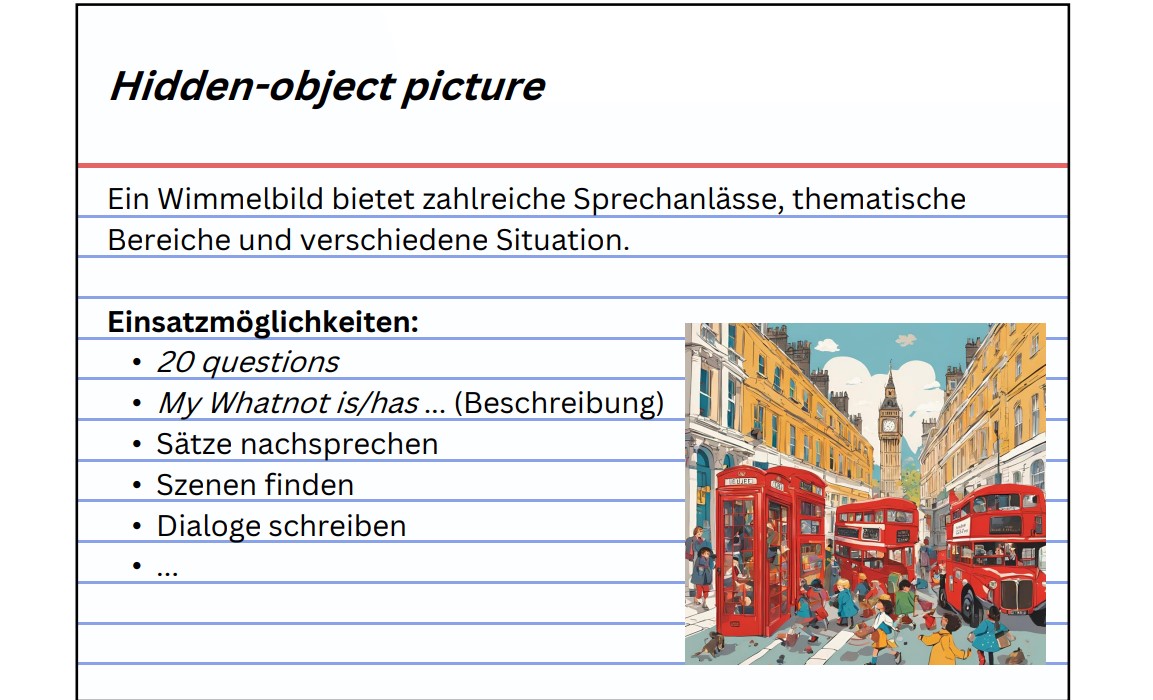 Unterrichtstunden im Fach Englisch mit hohem Sprechanteil für die Schülerinnen und Schüler selbst zu gestalten, stellt die Lehrkraft oftmals vor eine große Herausforderung. Wie die Methoden schülerorientiert und motivierend in eine Unterrichtstunde mit hohem Sprechanteil und vielfältiger Aktivierung der Lernenden eingebunden werden können, zeigt das im Folgenden zum Download bereitstehende Praxisbeispiel Excuse me, how do I get to Big Ben? Kerninhalt des Unterrichtsbeispiels ist die Thematik „Wegbeschreibung“ in der 6. Jahrgangsstufe.