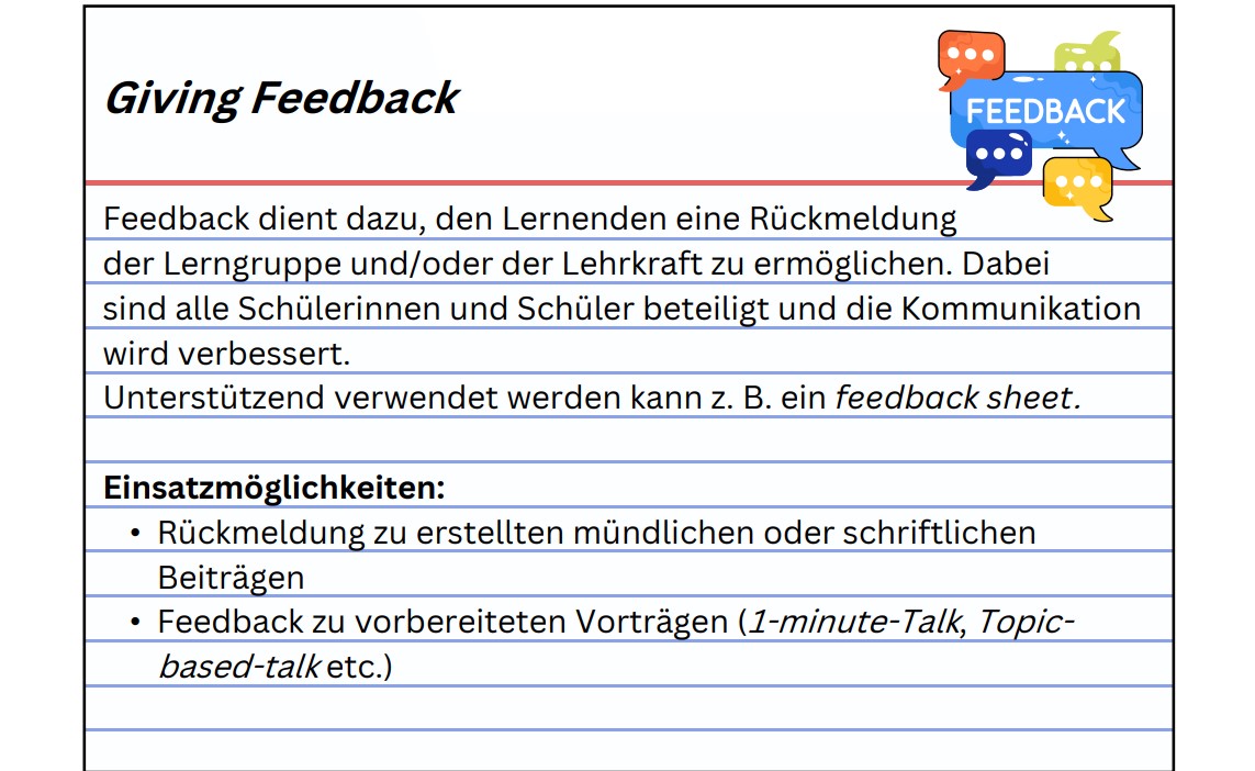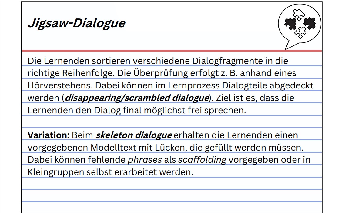Eine kommunikationsrelevante Aufarbeitung der zu erlernenden Redemittel ist notwendig, da man zur Konversation u.a. Fragen, Antworten, Kurzantworten, Aussagen, Ellipsen und andere pragmatische Kurzformen benötigt. Die Schülerinnen und Schüler erlernen die nötigen Grundlagen, um in authentischen Situationen agieren und kommunizieren zu können. Die Redemittel können in Heften / Tabellen / wordbanks schriftlich festgehalten und auch im Klassenzimmer visualisiert werden.