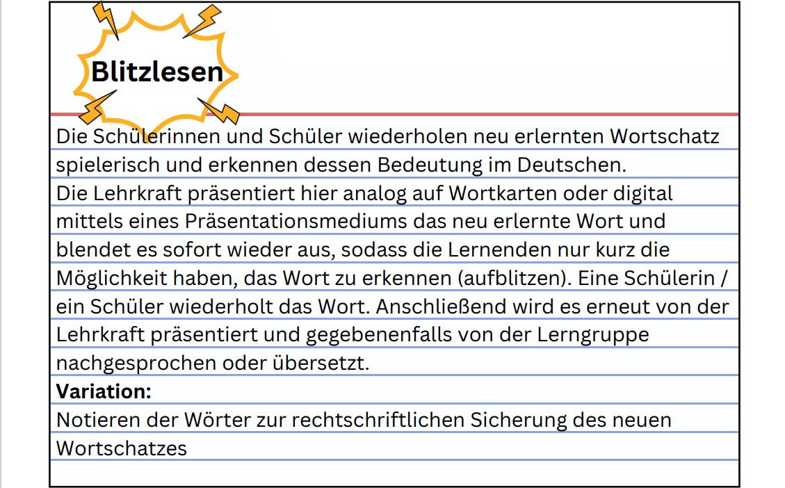 Um eine monotone und reizarme Lernsituation zu vermeiden, dient der gezielte Einsatz von Humor, da Gefühlsregungen und Stimmungen die Handlungsbereitschaft eines Menschen ganz erheblich beeinflussen. Das Erzählen von Witzen, Visualisieren von Redemitteln durch Cartoons, skurrile Geschichten usw. bringen Abwechslung in das Unterrichtsgeschehen und tragen positiv zur Verinnerlichung und zum situations- und bedarfsgerechten Abrufen der Redemittel bei.