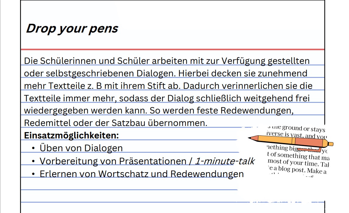 Zur gesprochenen Sprache gehören auch Elemente der nonverbalen Kommunikation wie Mimik, Gestik und Körpersprache. Diese dürfen nicht außer Acht gelassen werden - weder durch die Lehrkraft noch beim Sprechen durch die Schülerinnen und Schüler. Diese Kommunikationselemente fungieren unter anderem als bypassing strategies, welche helfen, die Kommunikation aufrecht zu erhalten, sollte der aktive Wortschatz der Schülerinnen und Schüler in einer Kommunikationssituation nicht ausreichen.